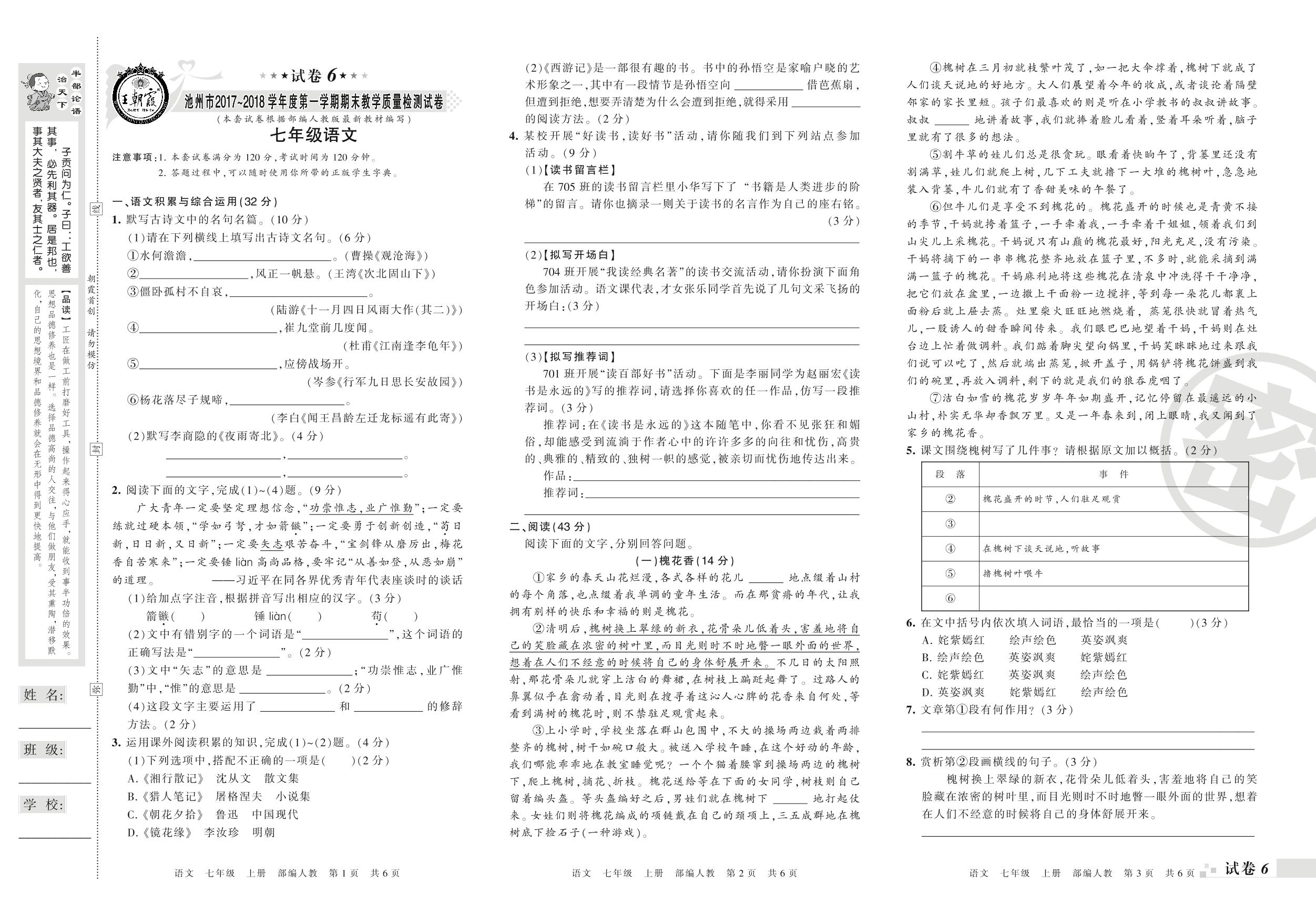 2017-2018学年第一学期池州市七年级语文试卷(人教版)【6】