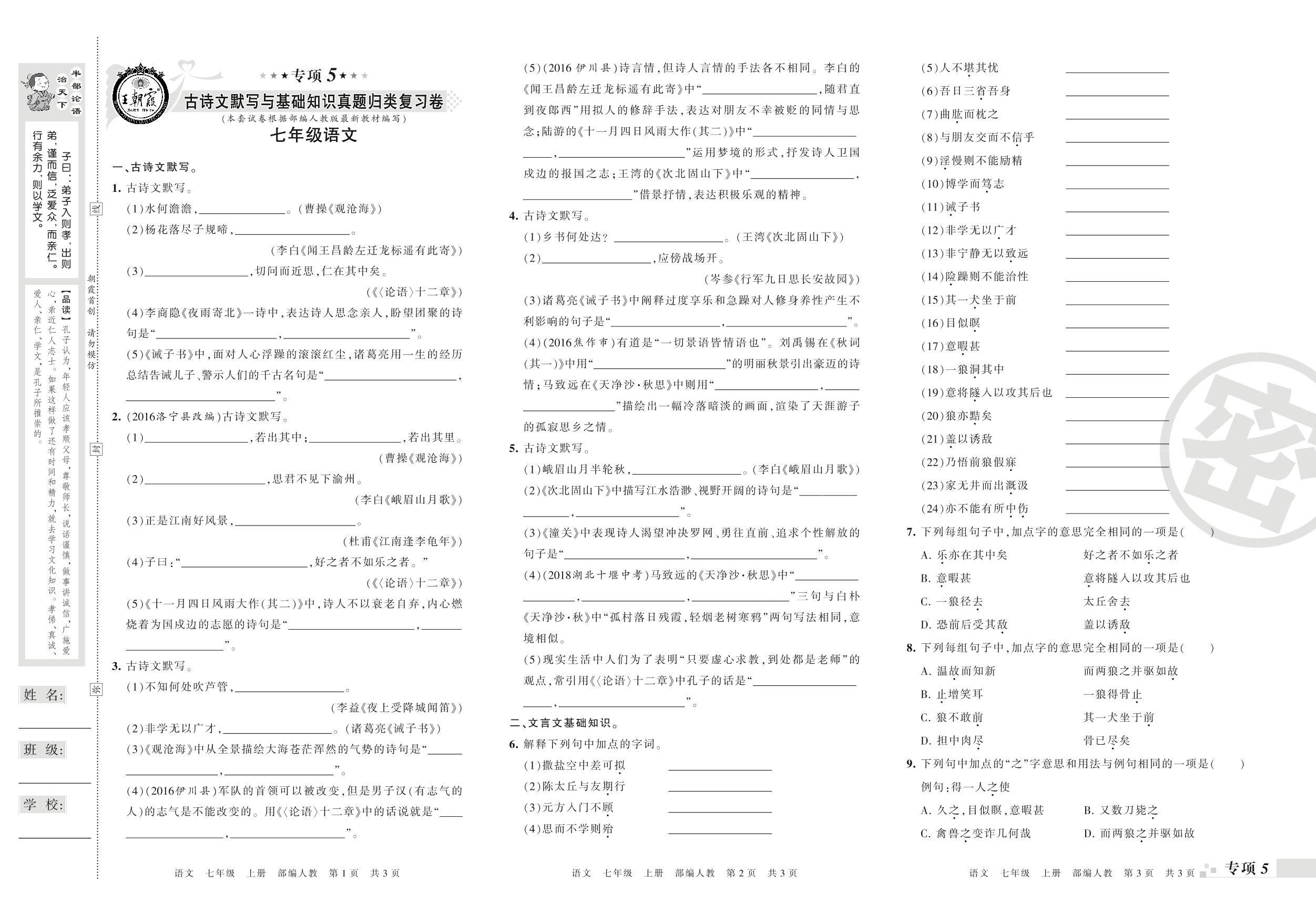 王朝霞期末专项卷——古诗文默写与基础知识、课内文言文阅读真题归类复习卷七年级上册语文(人教版)_R210802163414【0】