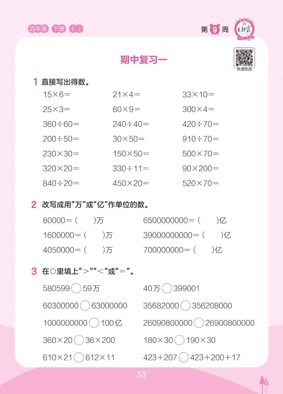 2023下册四年级数学苏教版 第9周 期中复习一(计算专练)
