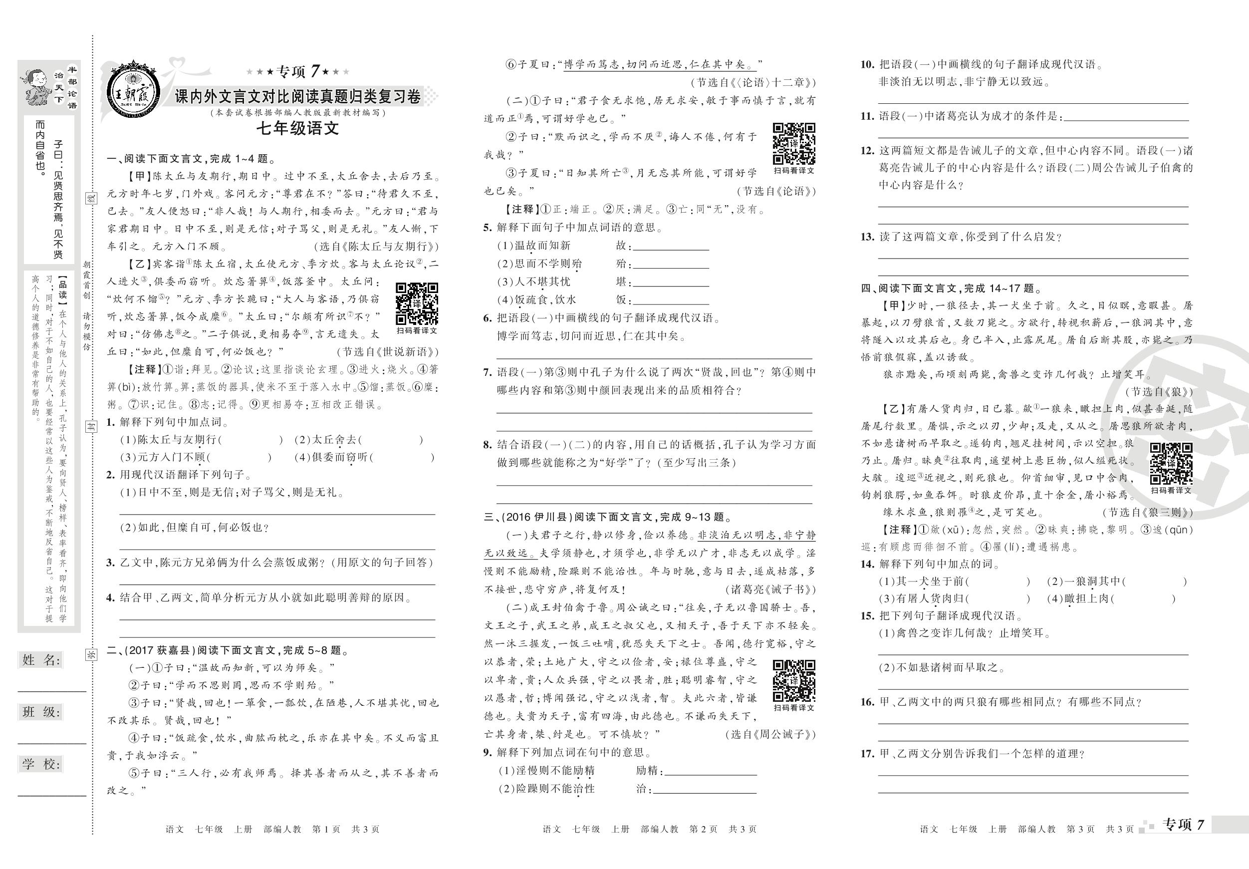 王朝霞期末专项卷——课内外文言文对比阅读、古诗词阅读真题归类复习卷七年级上册语文(人教版)_R210802163421【0】