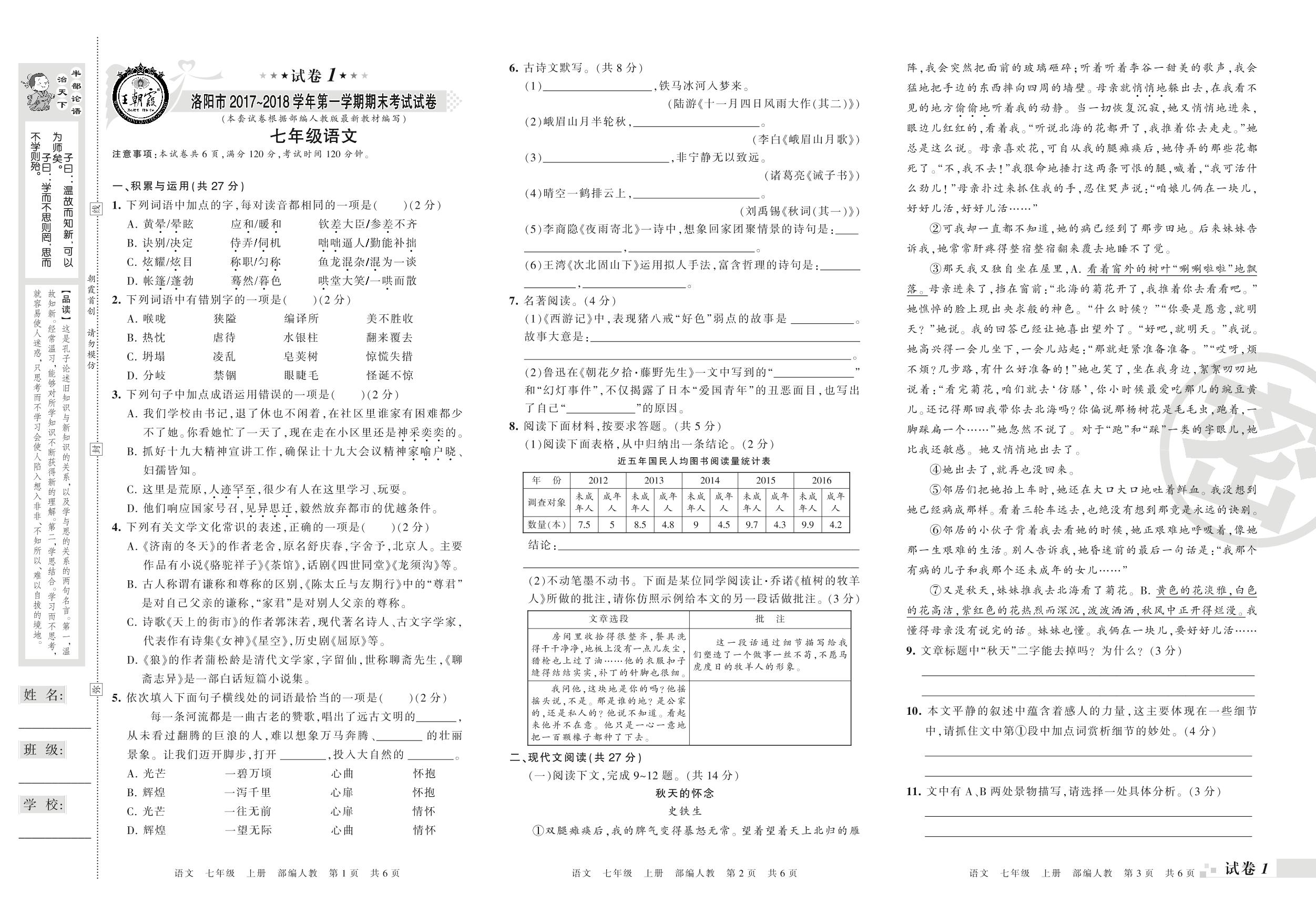 2017-2018学年第一学期洛阳市七年级语文试卷(人教版)【1】