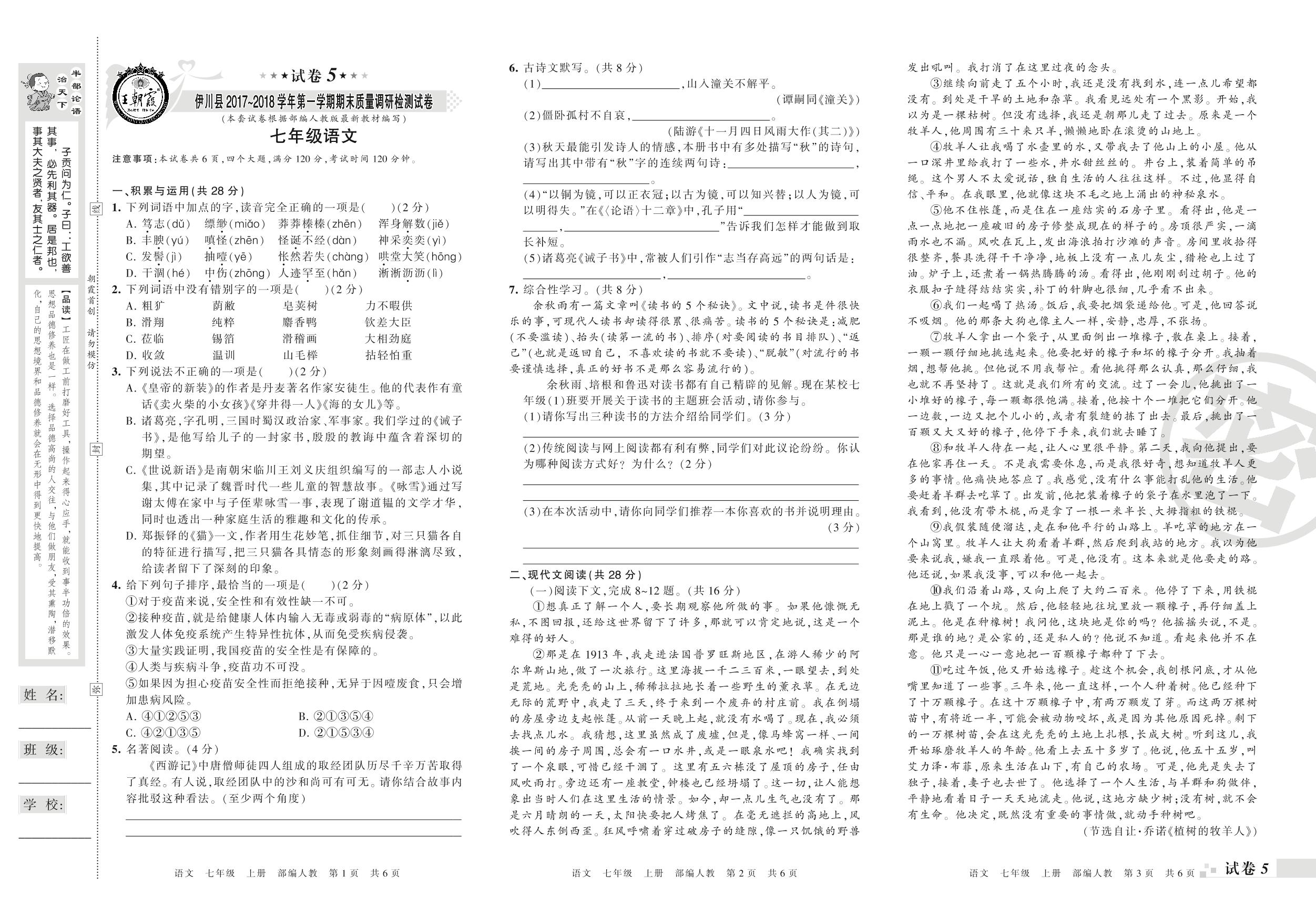 2017-2018学年第一学期洛阳市伊川县七年级语文试卷(人教版)【5】