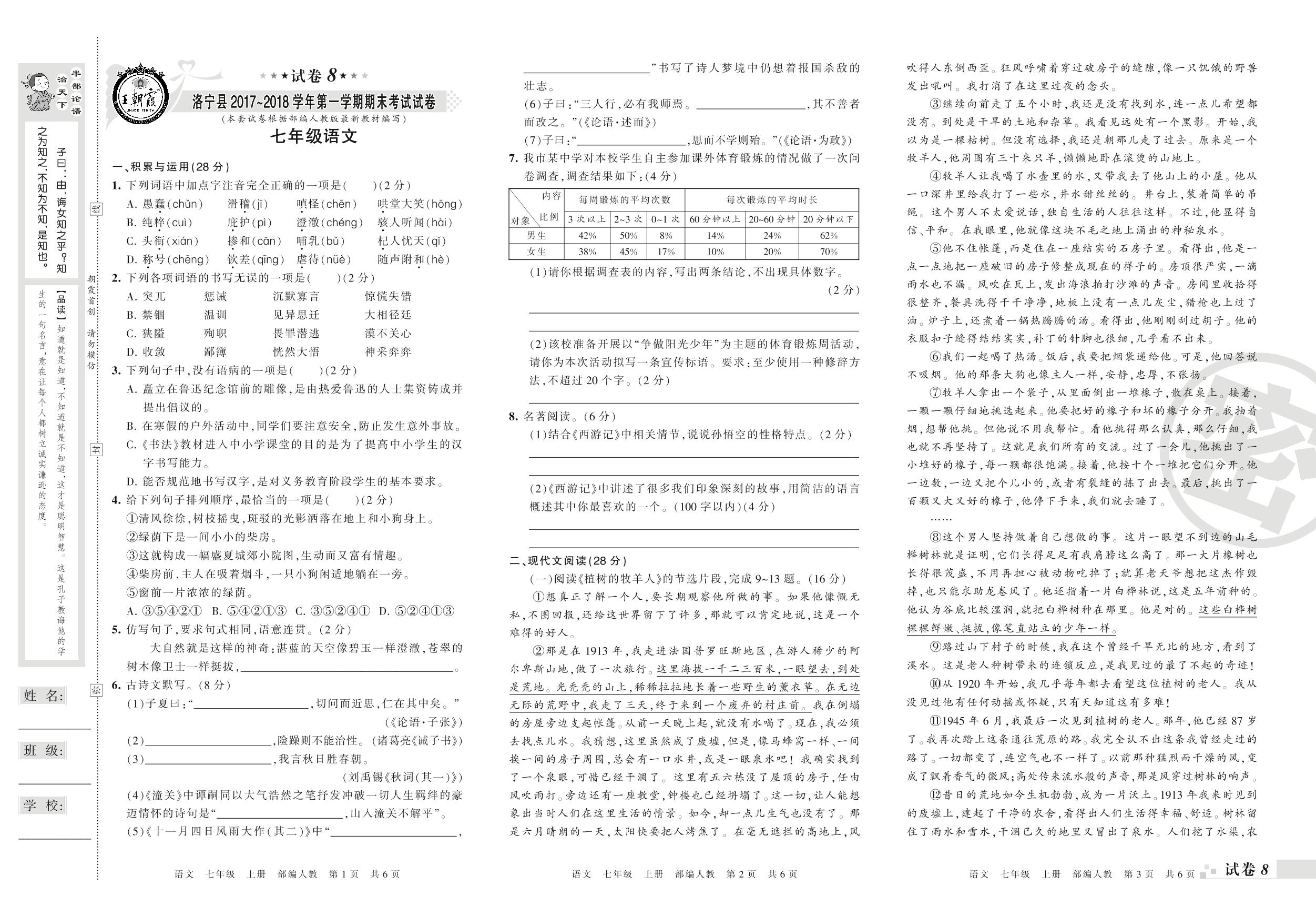 2017-2018学年第一学期洛阳市洛宁县七年级语文试卷(人教版)【8】