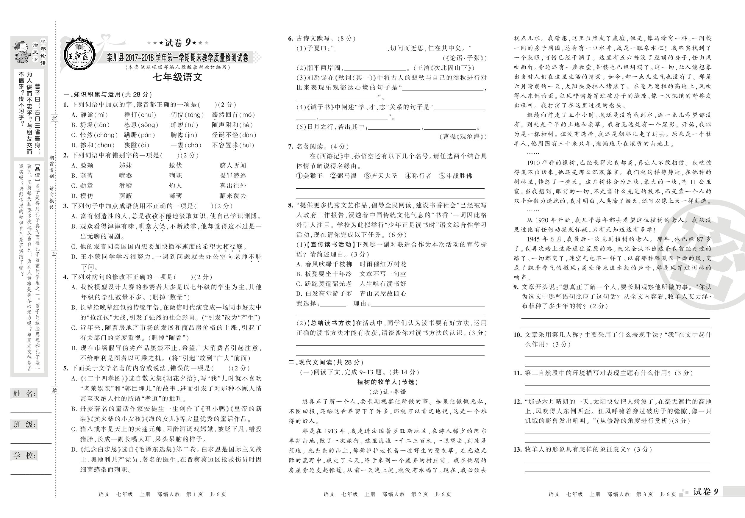 2017-2018学年第一学期洛阳市栾川县七年级语文试卷(人教版)【9】