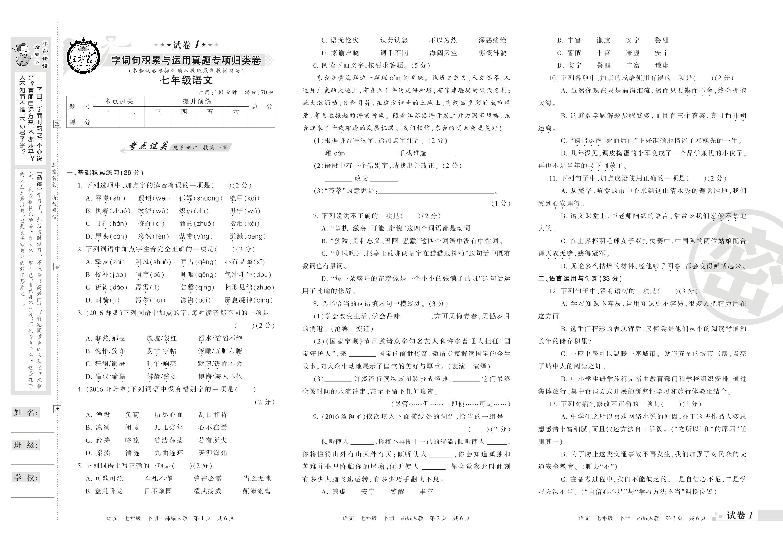王朝霞期末专项卷——字词句积累与运用真题专项归类卷七年级下册语文(人教版)_R210802163623【1】