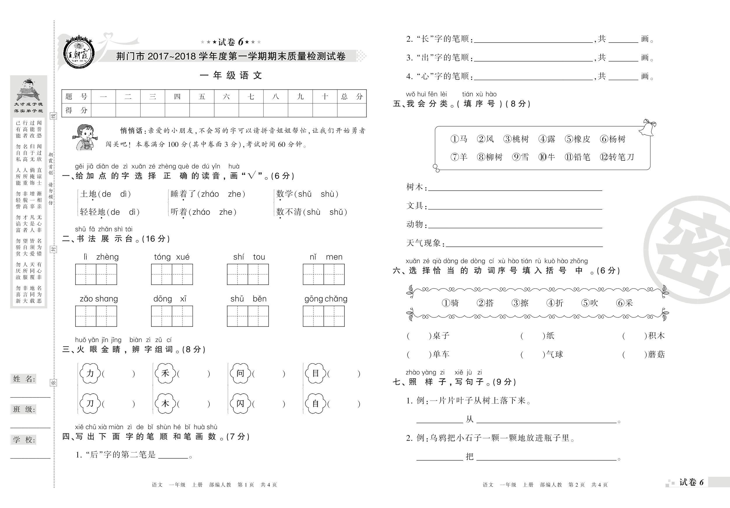 2017-2018学年第一学期荆门市一年级语文试卷(人教版)【6】