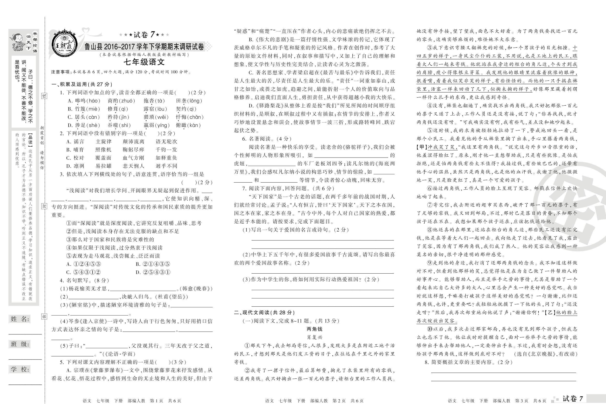 2016-2017学年第二学期平顶山市鲁山县七年级语文试卷(人教版)【7】