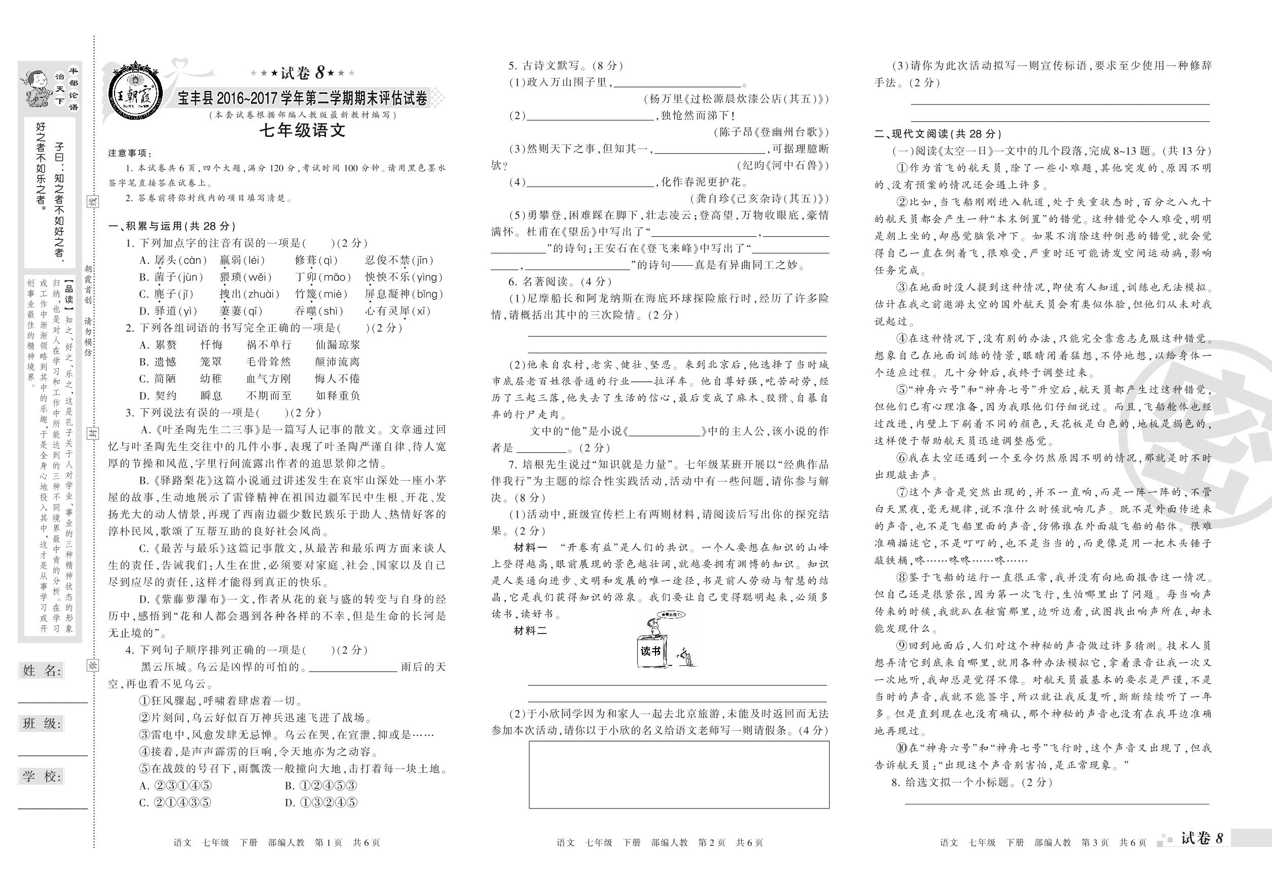 七年级语文人教版下册期末卷