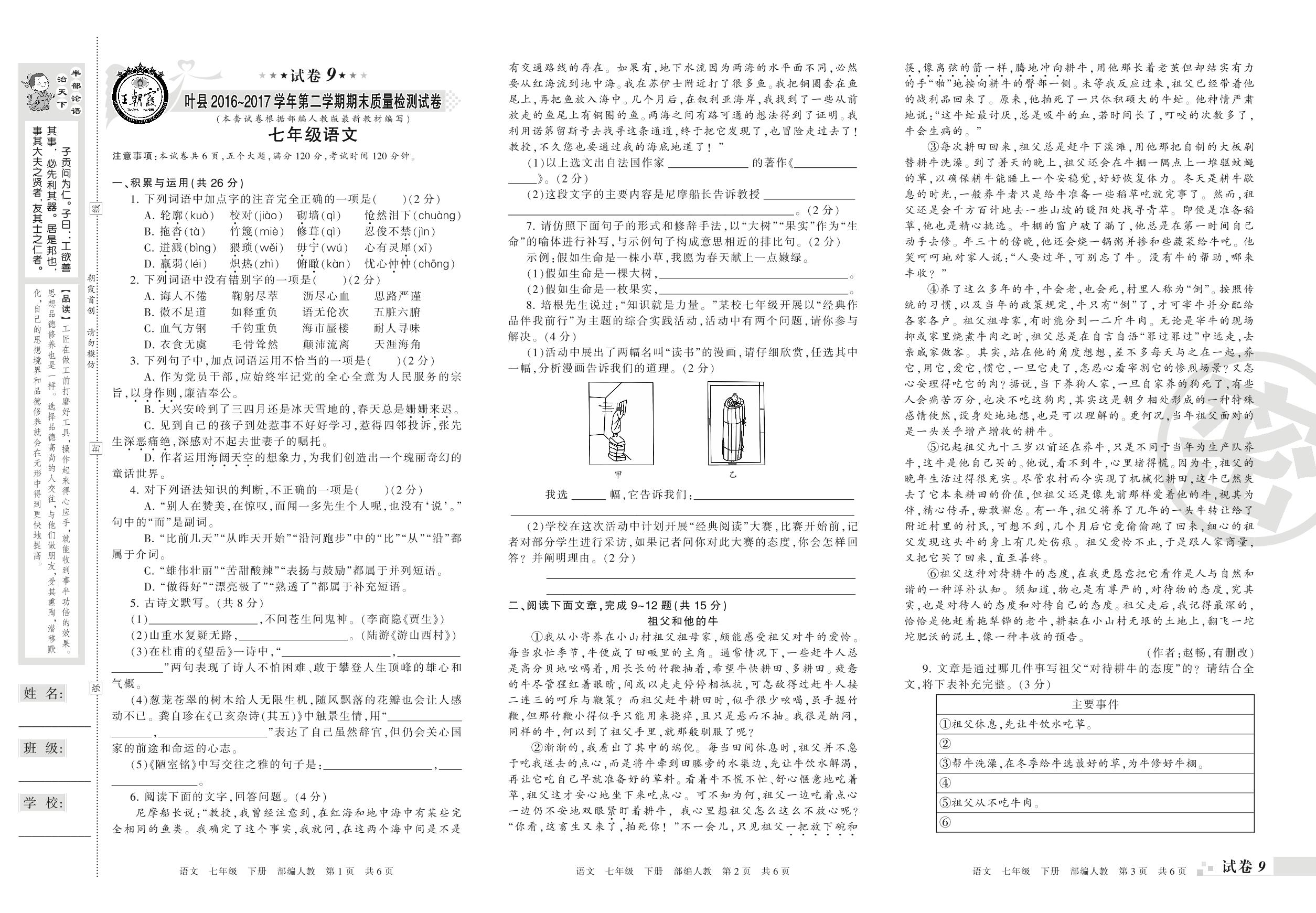 2016-2017学年第二学期平顶山市叶县七年级语文试卷(人教版)【9】