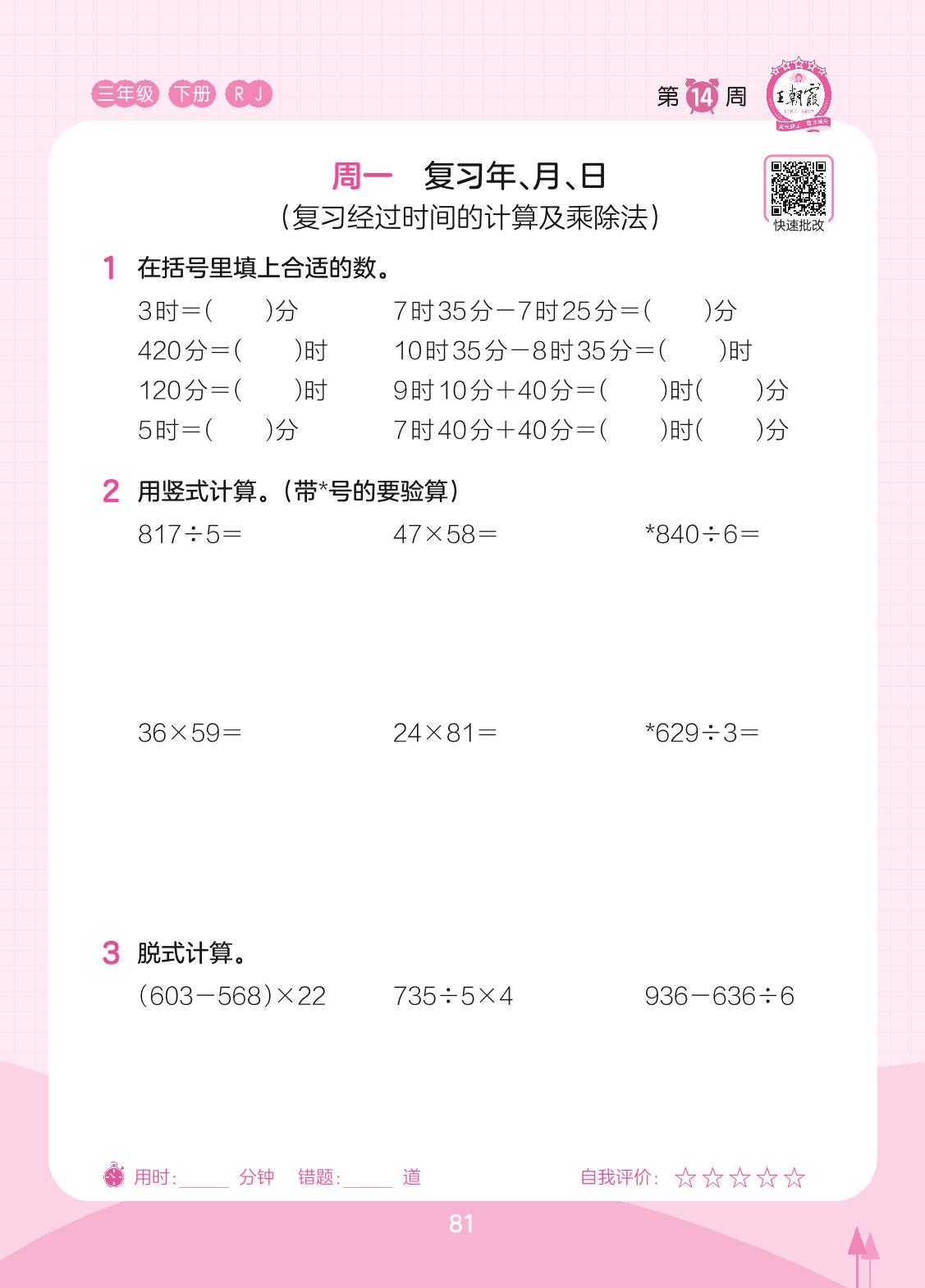 2023下册三年级数学人教版 第14周 周一