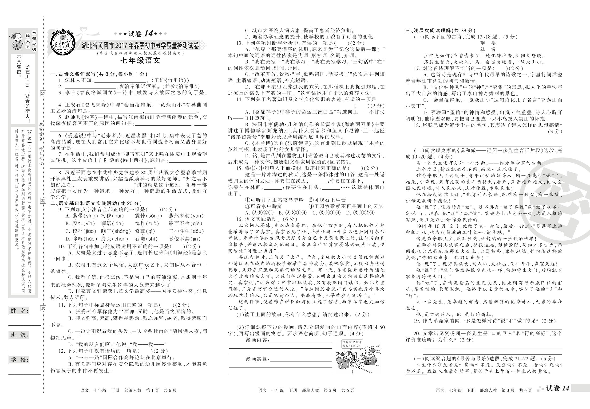 2016-2017学年第二学期湖北省黄冈市七年级语文试卷(人教版)【14】