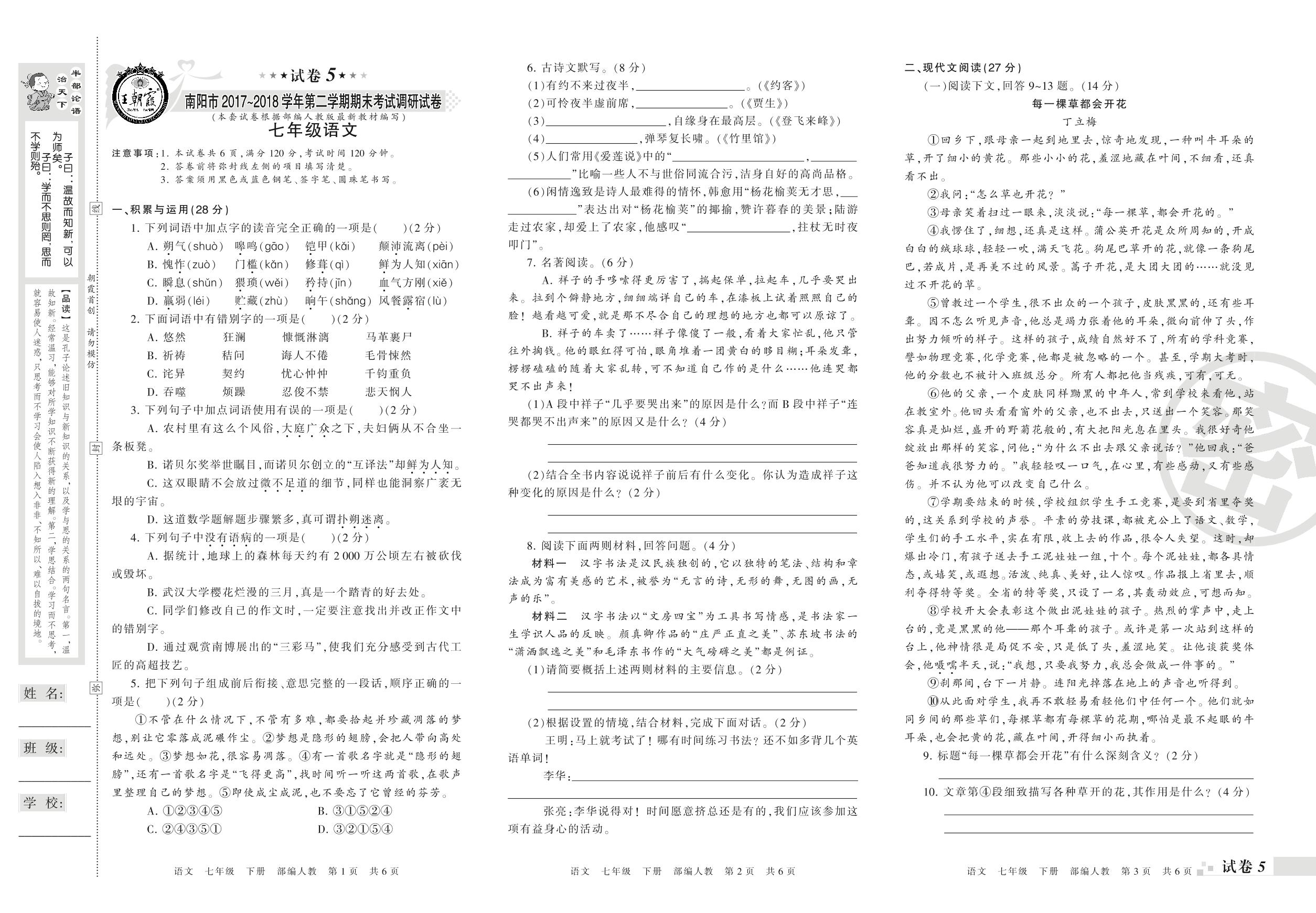 2016-2017学年第二学期南阳市七年级语文试卷(人教版)【5】