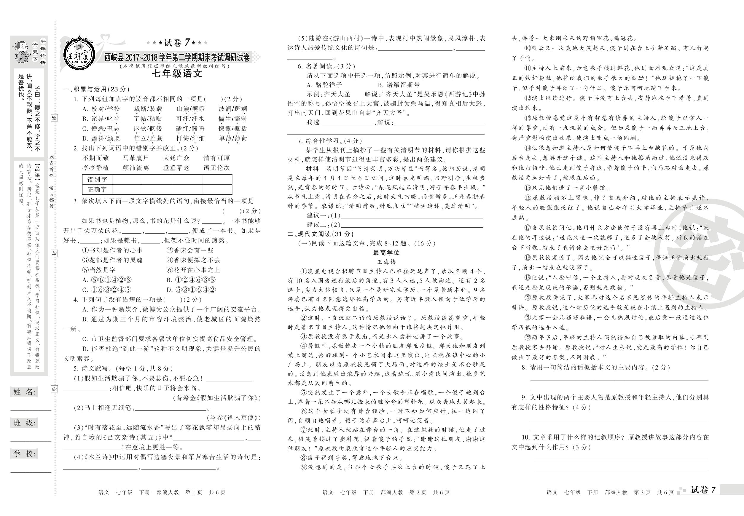 七年级语文人教版下册期末卷