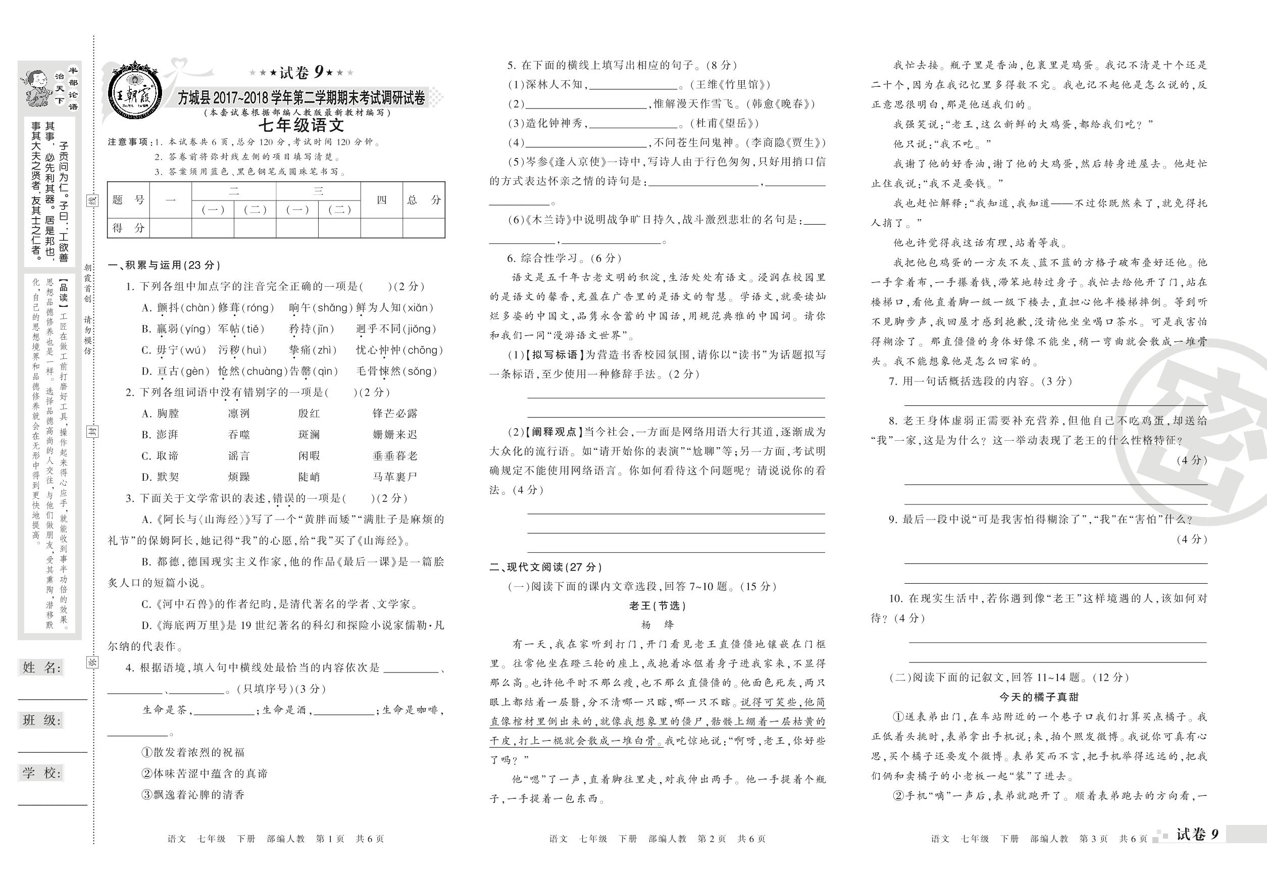 七年级语文人教版下册期末卷