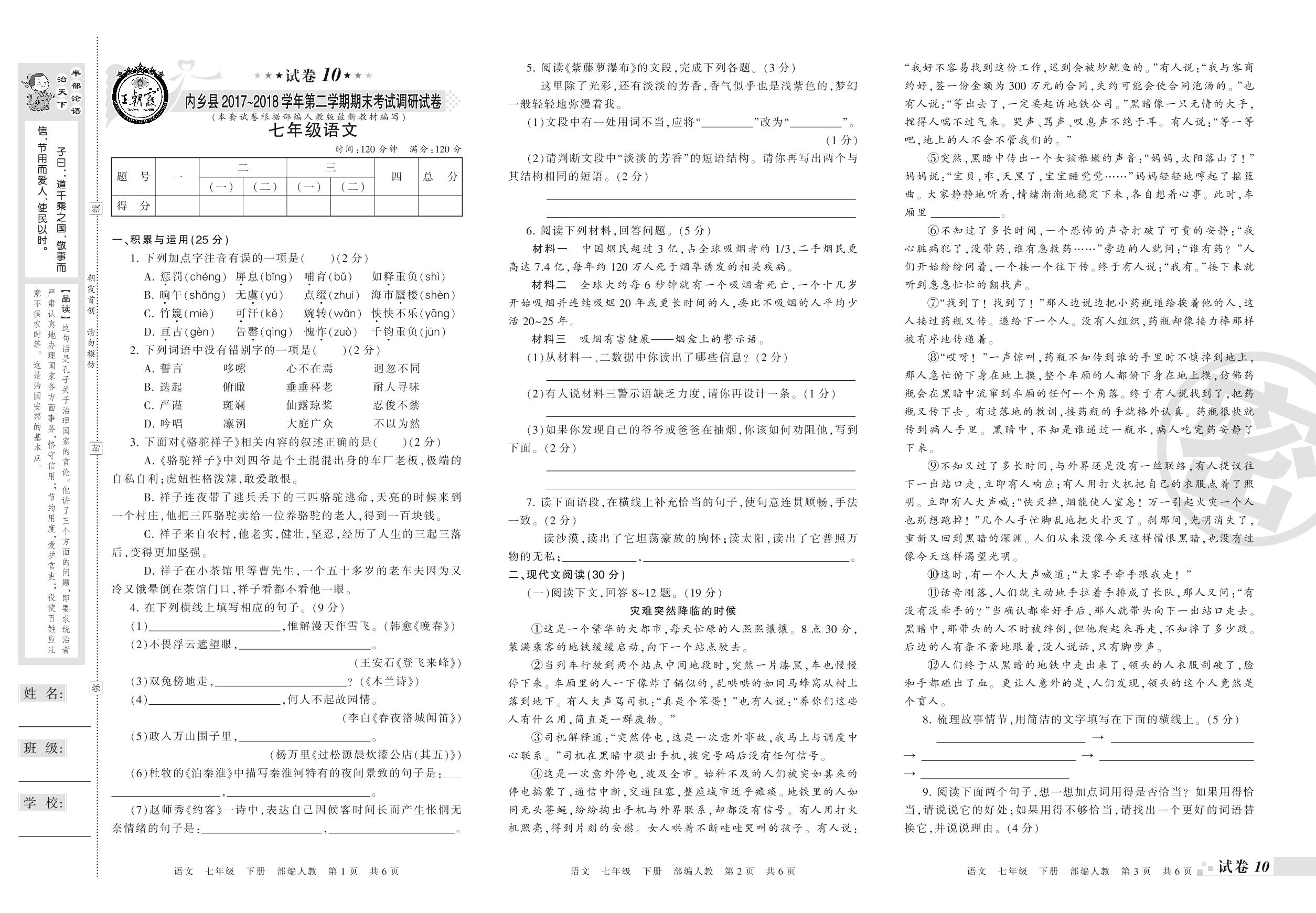 2016-2017学年第二学期南阳市内乡县七年级语文试卷(人教版)【10】
