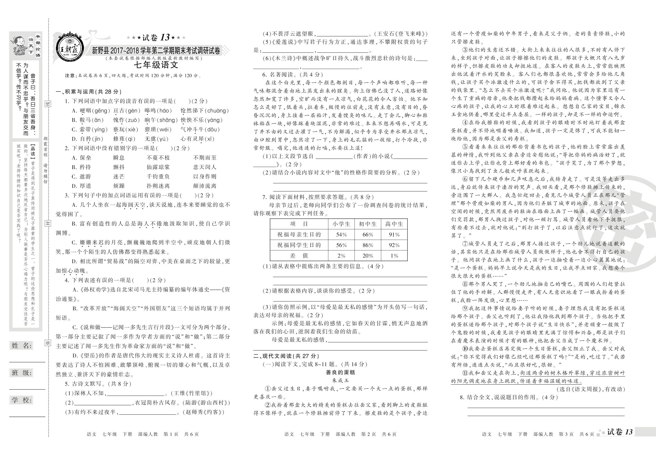 2016-2017学年第二学期南阳市新野县七年级语文试卷(人教版)【13】