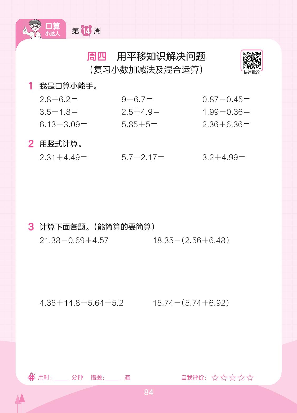 2023下册四年级数学人教版 第14周 周四