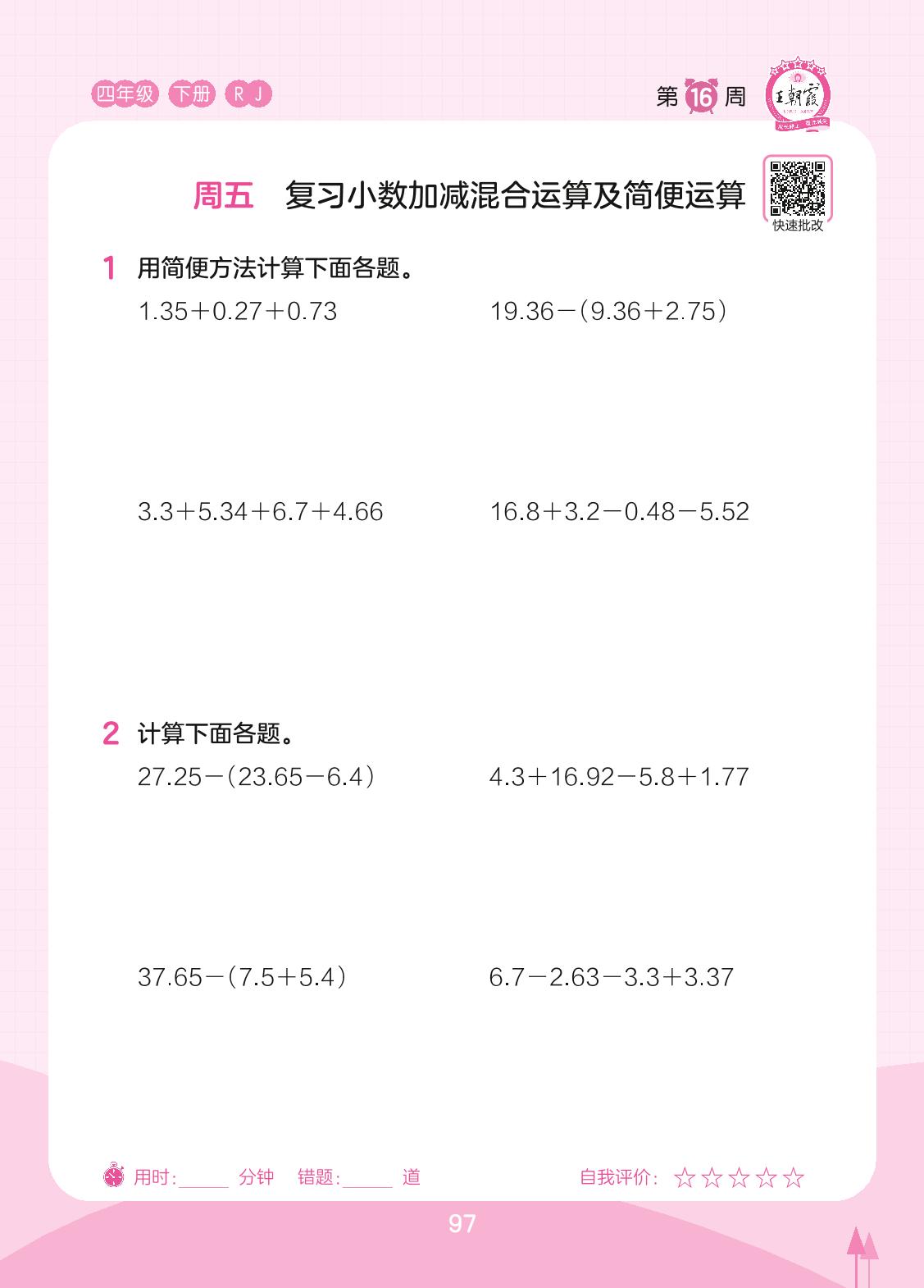 2023下册四年级数学人教版 第16周 周五