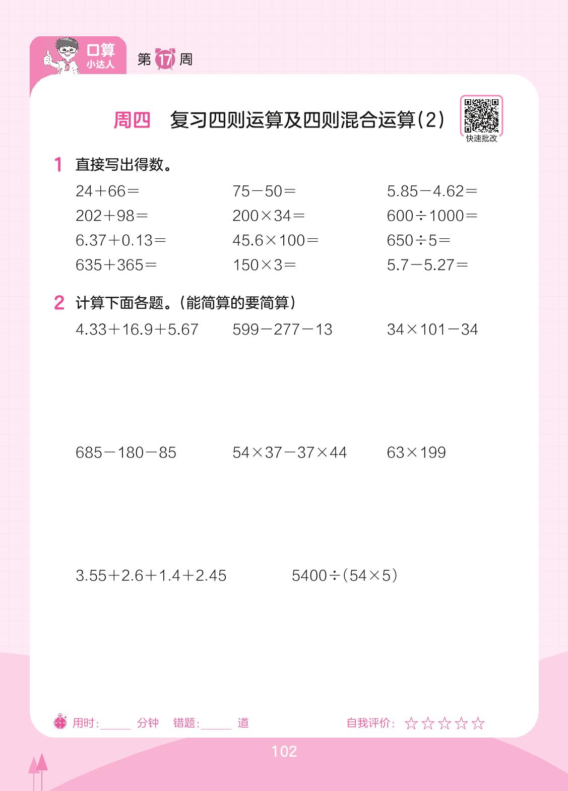 2023下册四年级数学人教版 第17周 周四