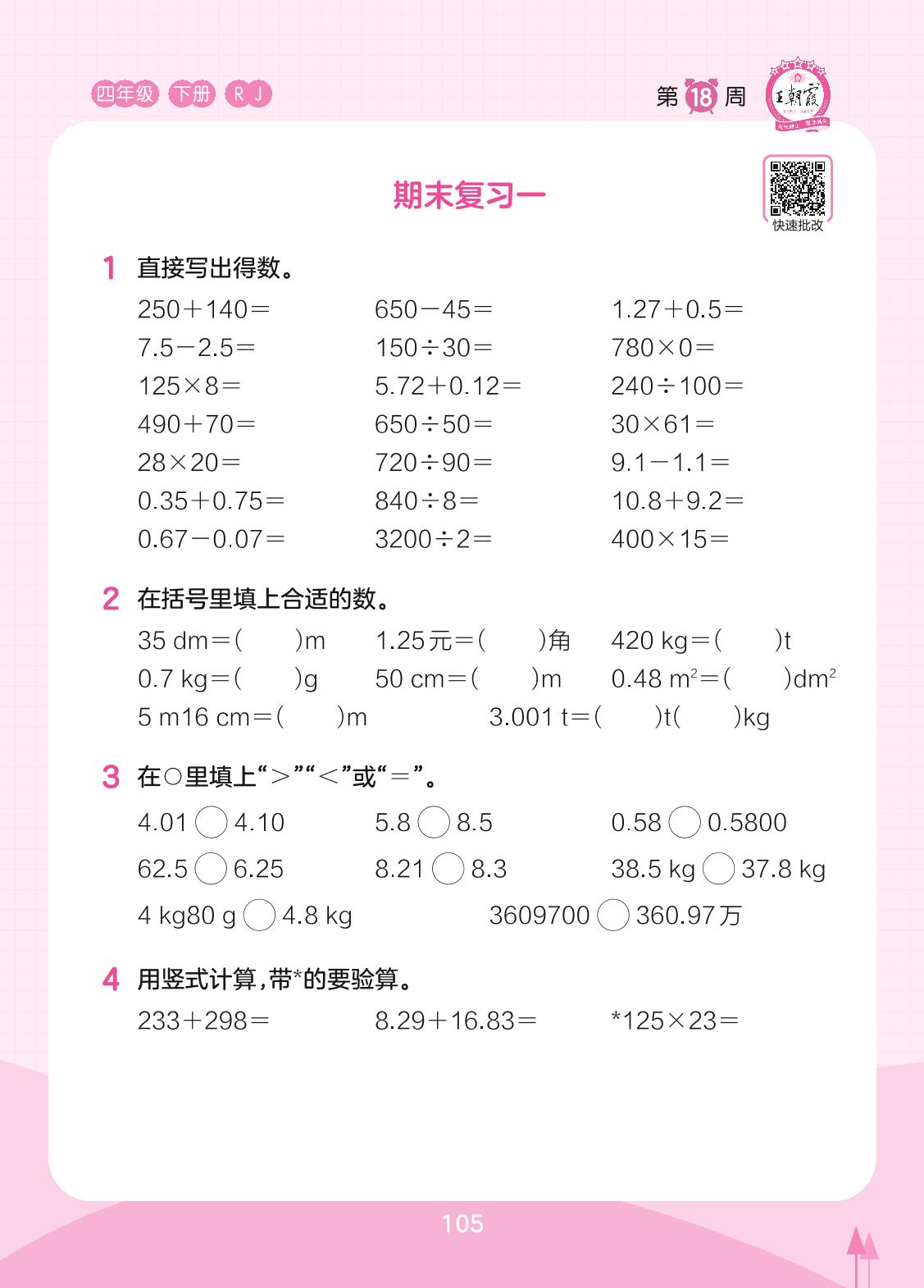 2023下册四年级数学人教版 第18周 期末复习一