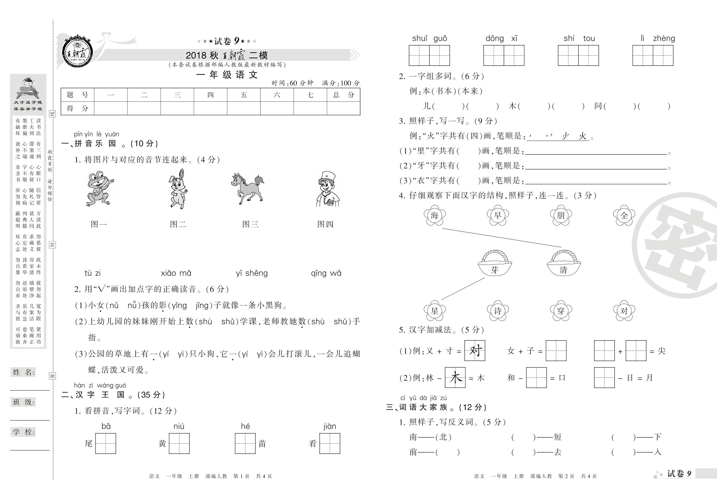 王朝霞期末模拟卷一年级上册语文(人教版)_R210731185422【9】