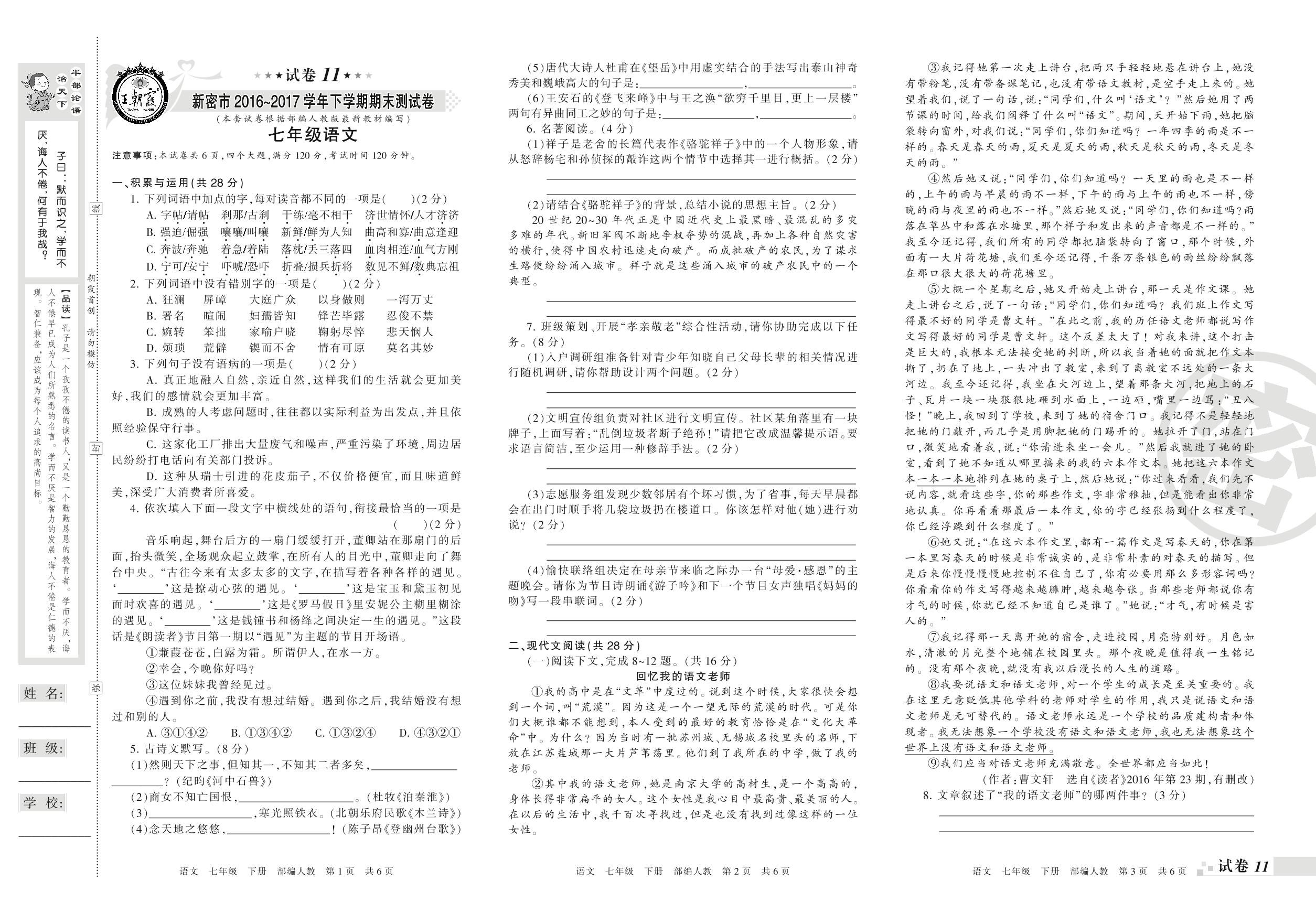 2016-2017学年第二学期新密市七年级语文试卷(人教版)【11】