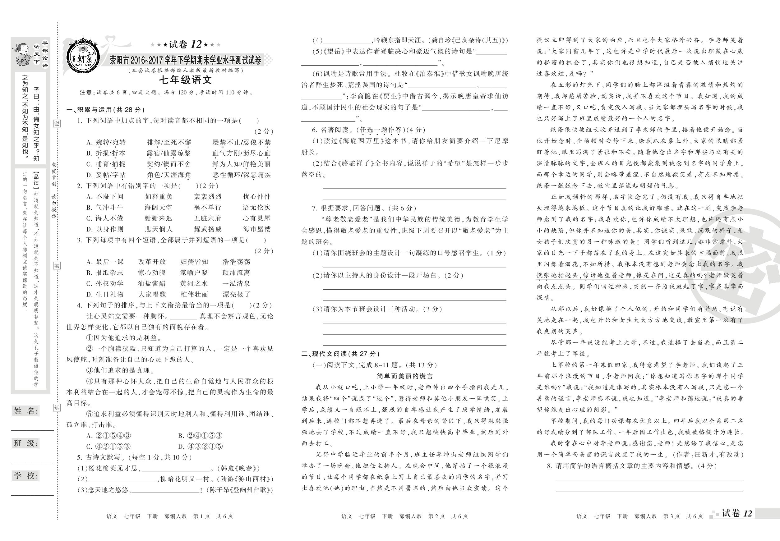 2016-2017学年第二学期荥阳市七年级语文试卷(人教版)【12】
