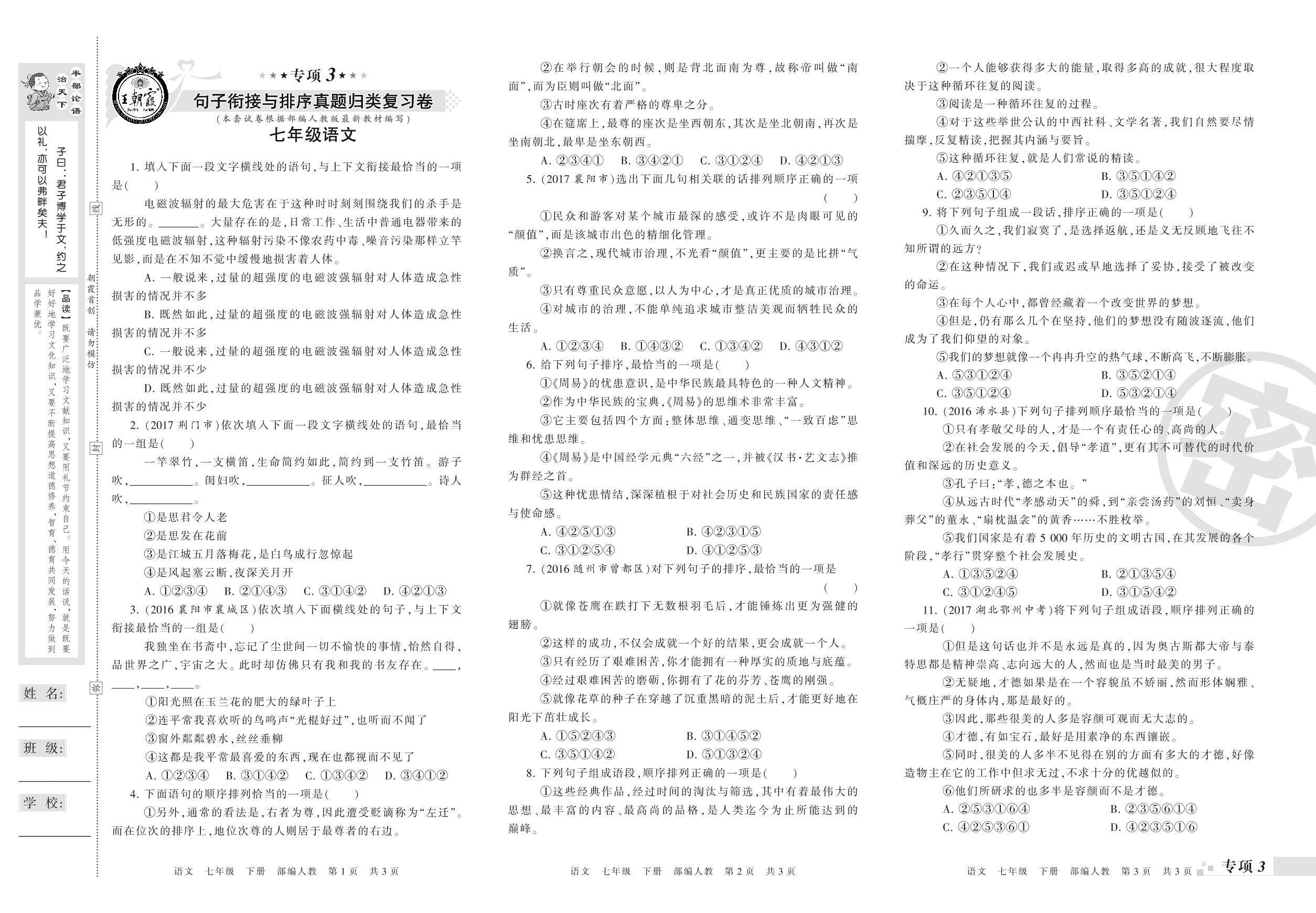 王朝霞期末专项卷——句子衔接与排序真题归类复习卷三七年级下册语文(人教版)_R210802164336【0】