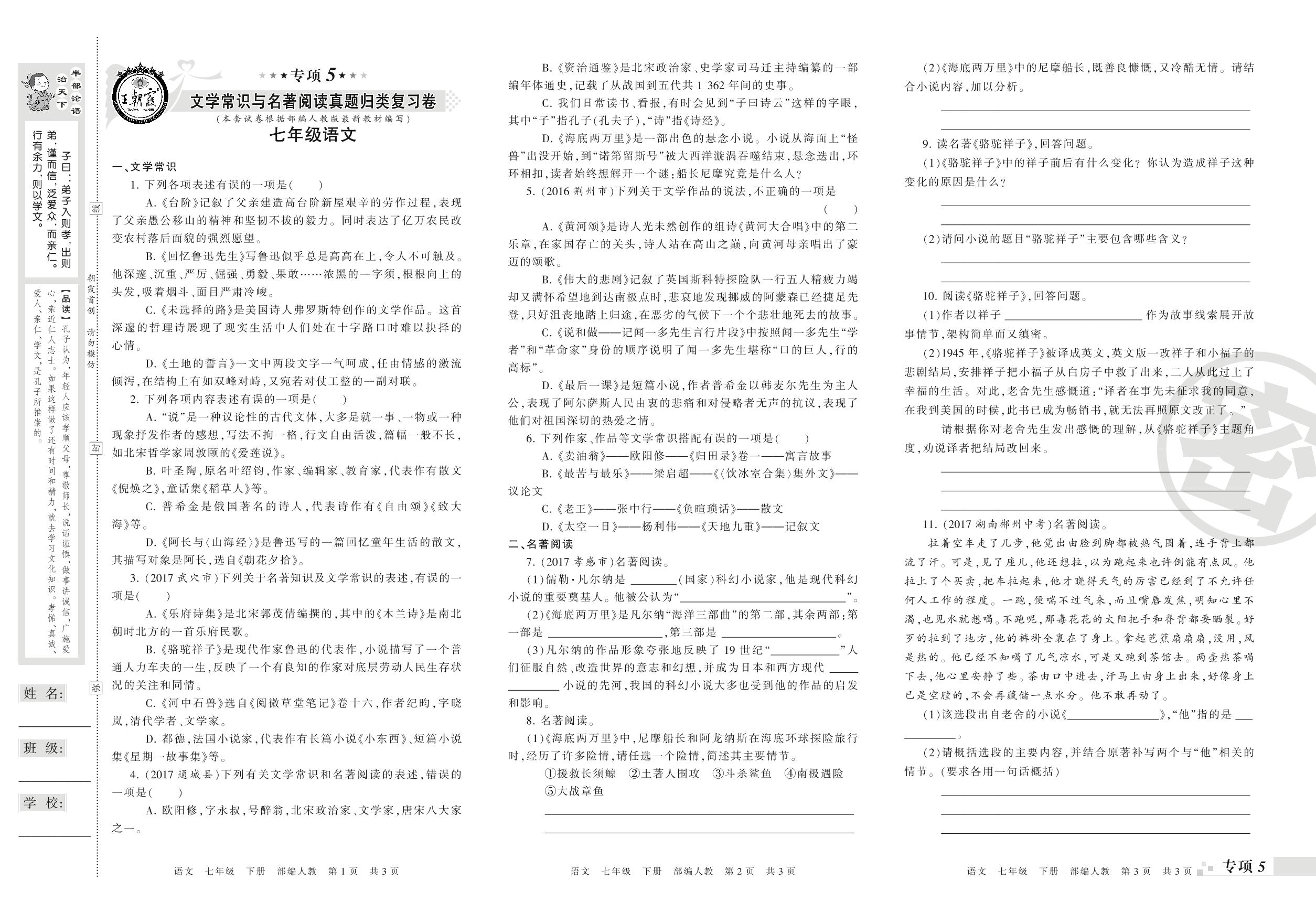 王朝霞期末专项卷——文学常识与名著阅读真题归类复习卷七年级下册语文(人教版)_R210802164342【0】