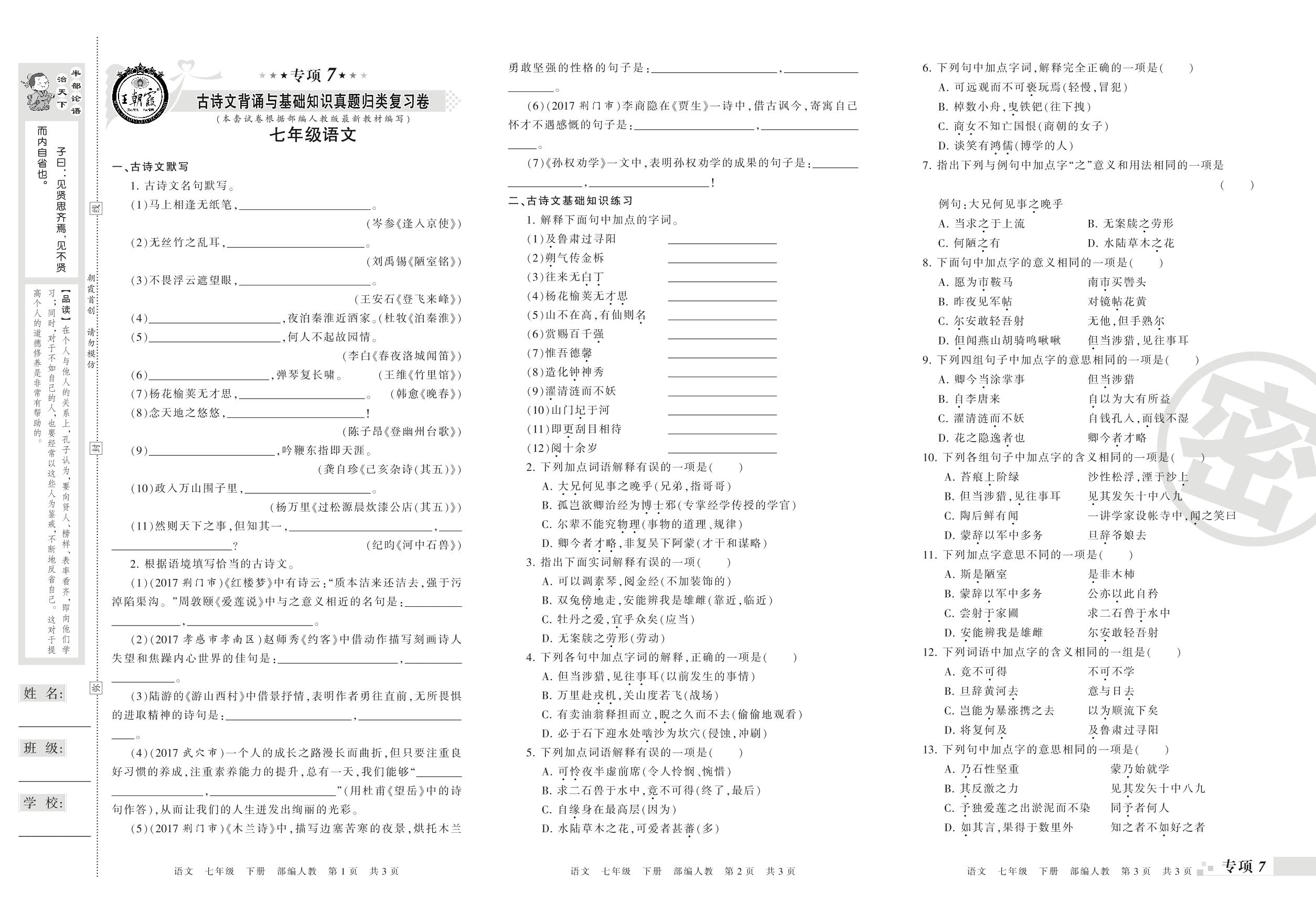 王朝霞期末专项卷——古诗文背诵与基础知识真题归类复习卷七年级下册语文(人教版)_R210802164353【0】