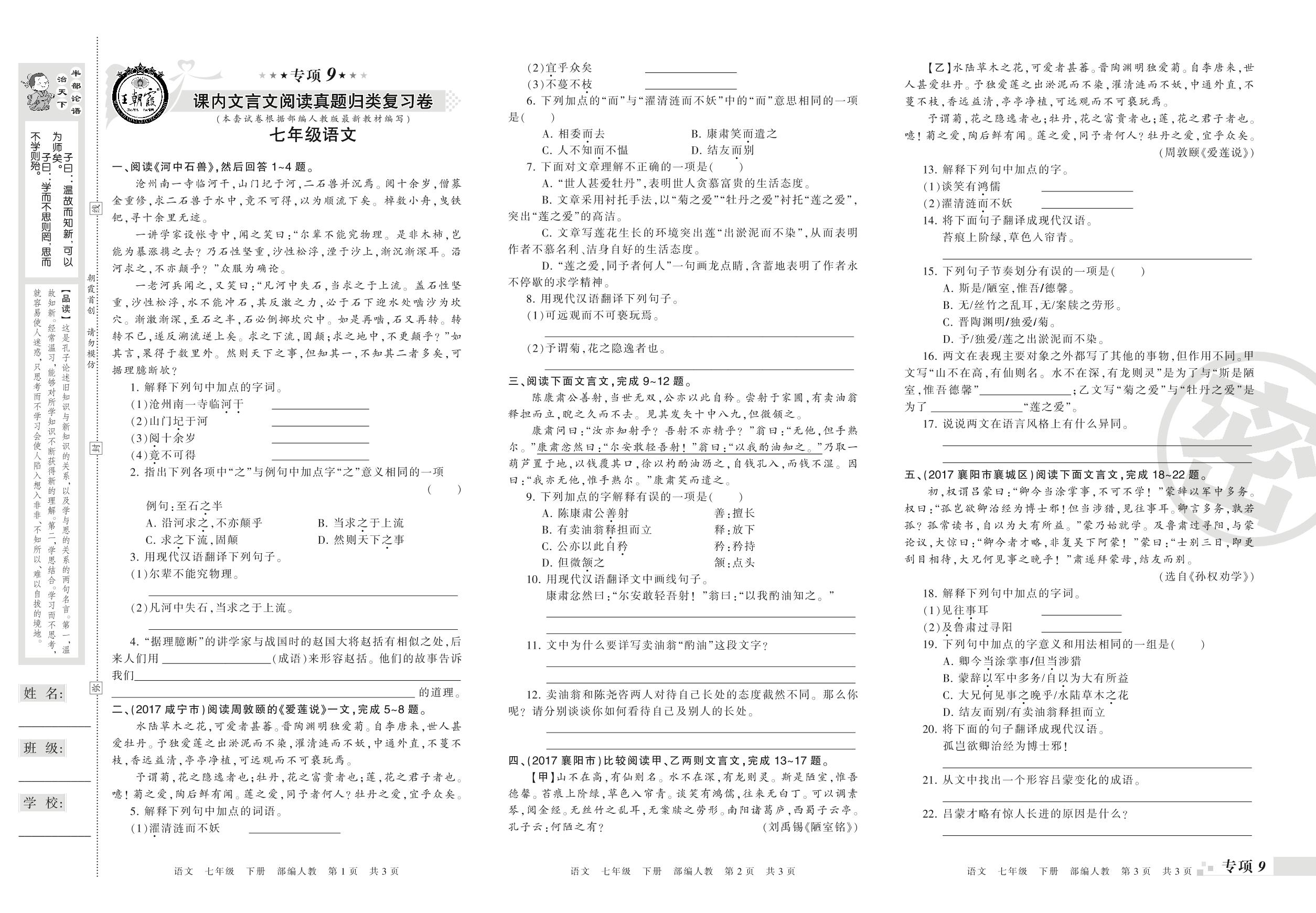 王朝霞期末专项卷——课内文言文阅读真题归类复习卷七年级下册语文(人教版)_R210802164358【0】