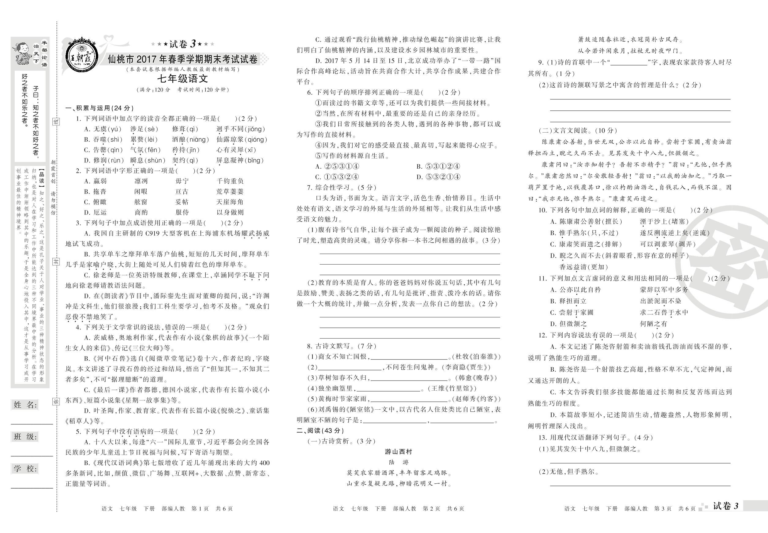 2016-2017学年第二学期仙桃市七年级语文试卷(人教版)【3】