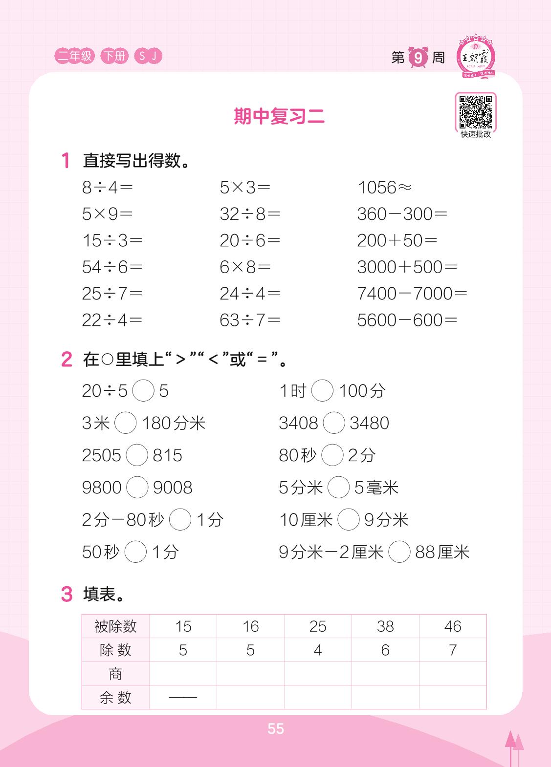 2023下册二年级数学苏教版 第9周 期中复习二(计算专练)