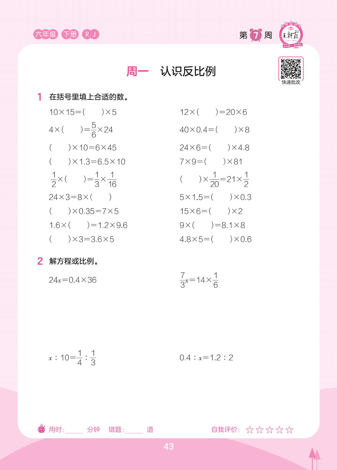 2023下册六年级数学人教版 第7周 周一