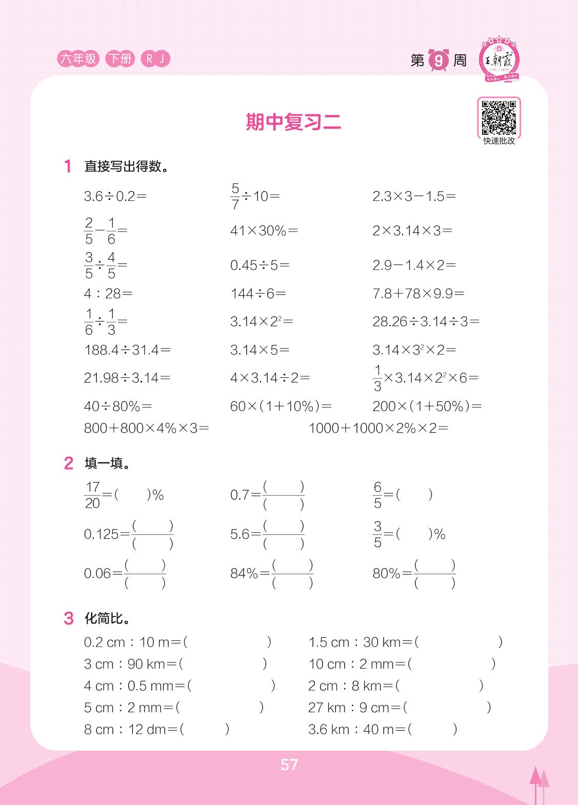 2023下册六年级数学人教版 第9周 期中复习二(计算专练)