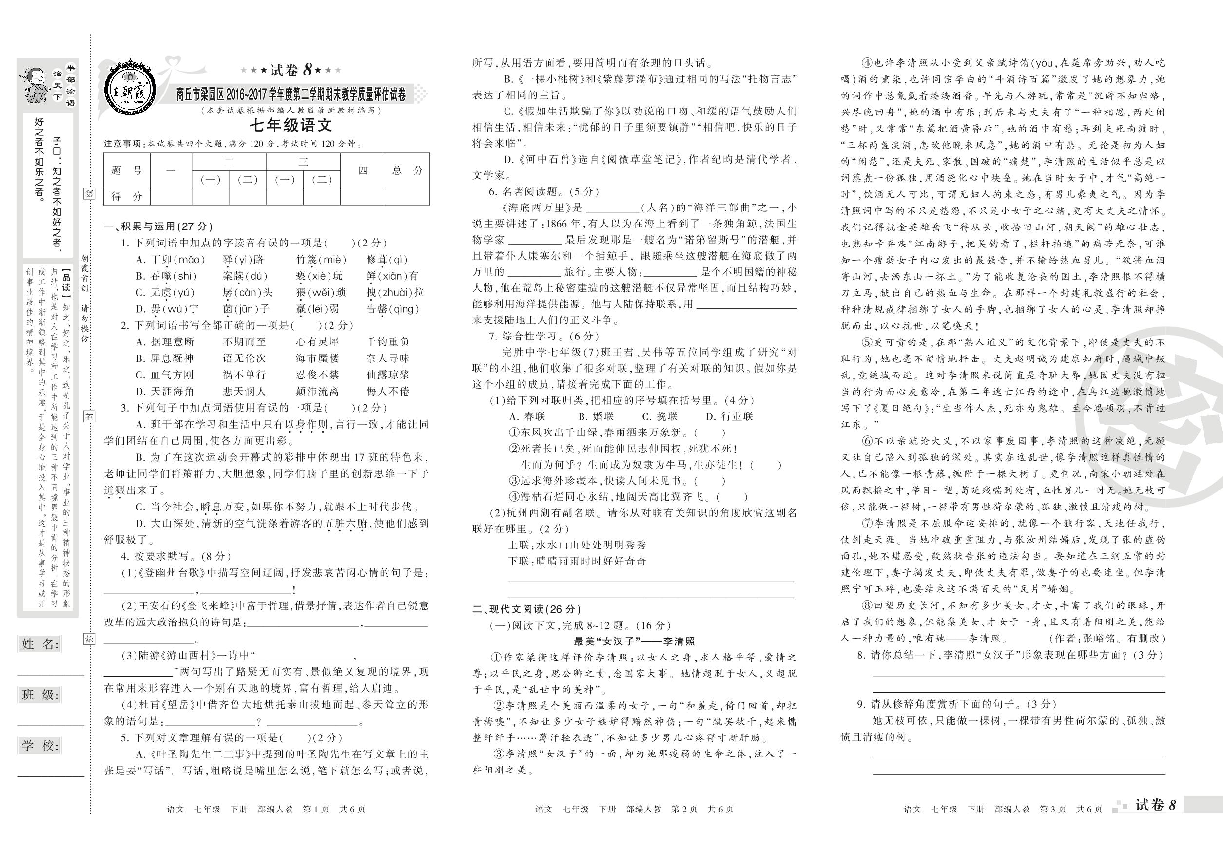 2016-2017学年第二学期商丘市七年级语文试卷(人教版)【8】