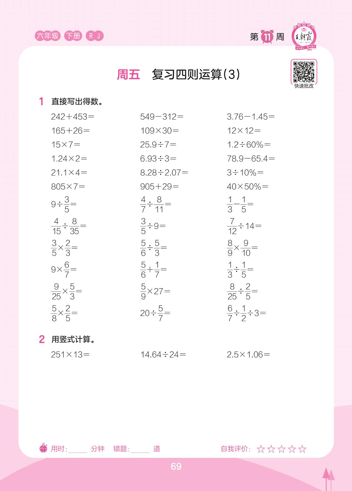 2023下册六年级数学人教版 第11周 周五