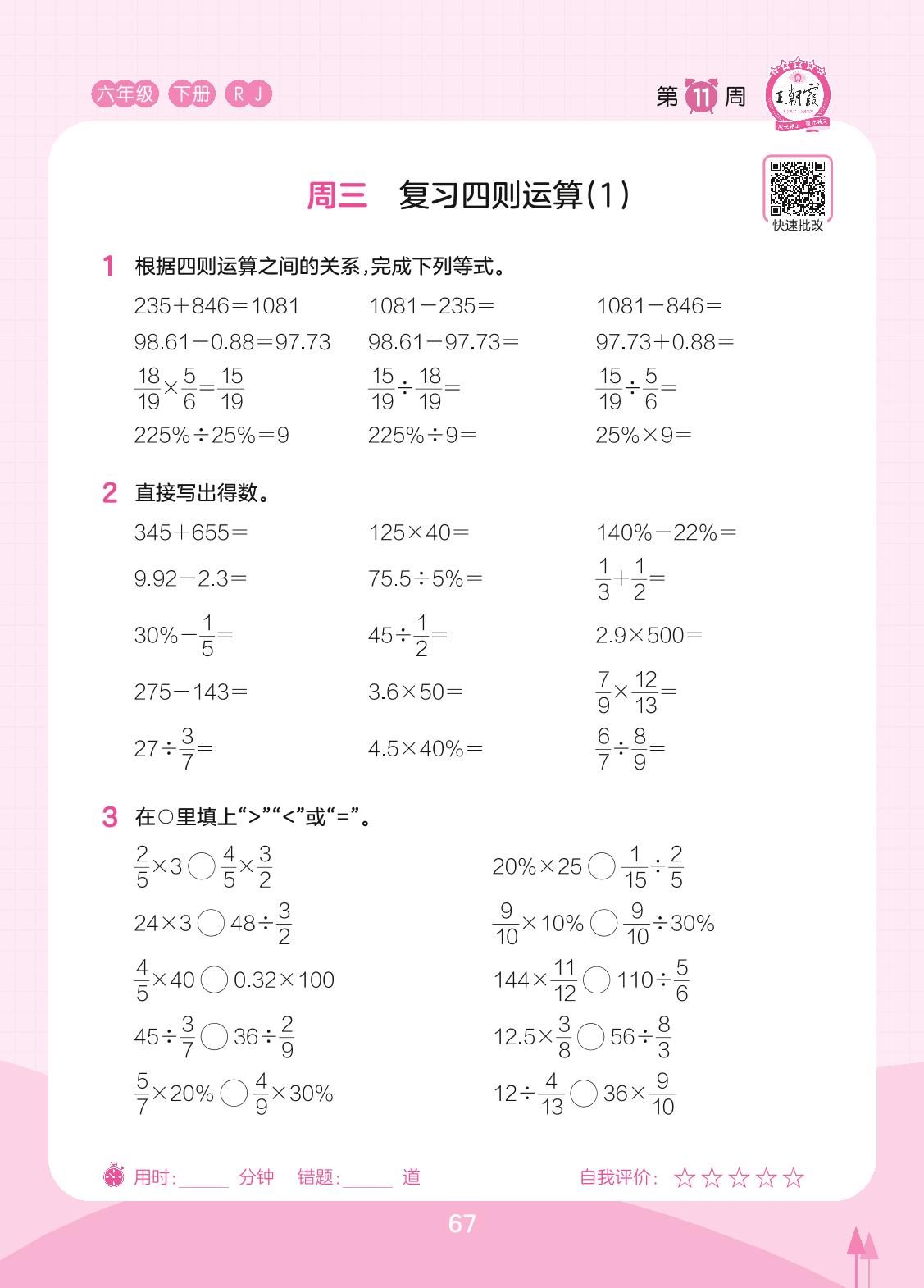 2023下册六年级数学人教版 第11周 周三