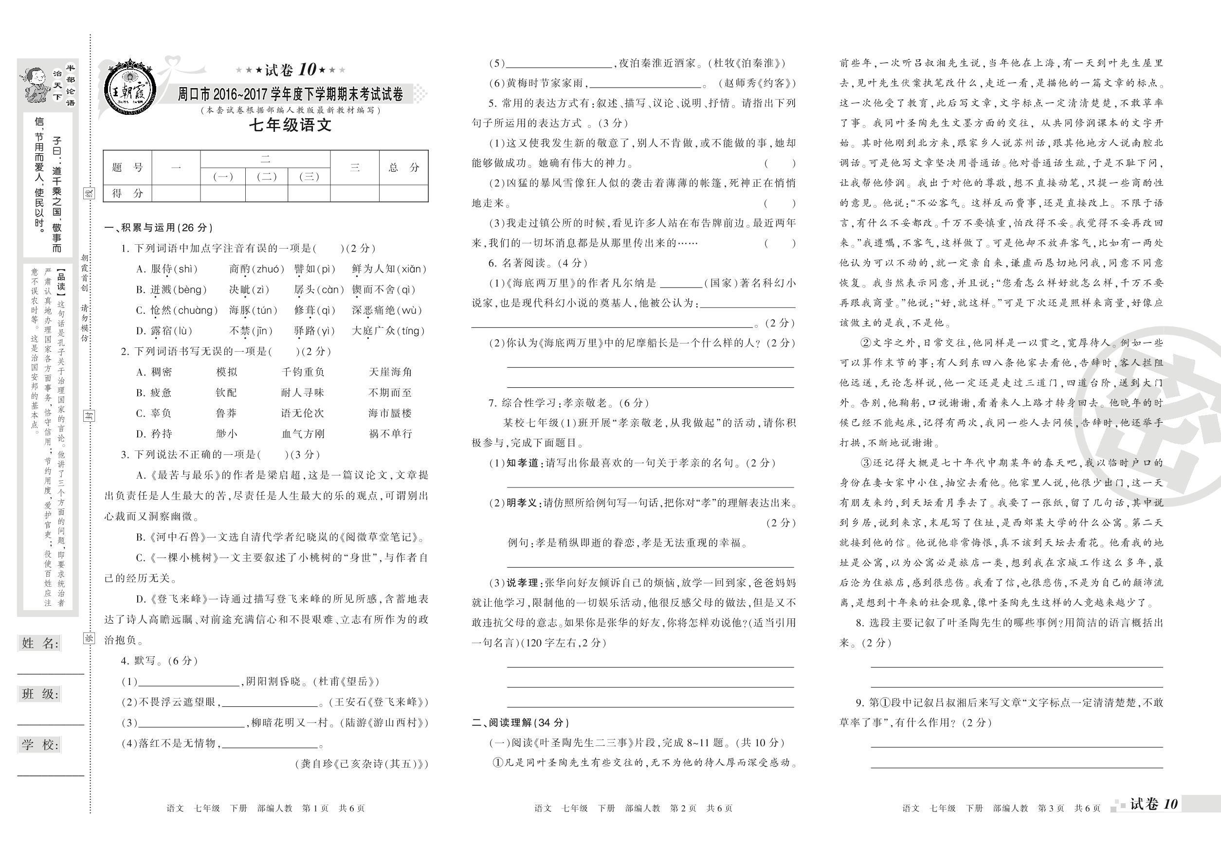 2016-2017学年第二学期周口市七年级语文试卷(人教版)【10】