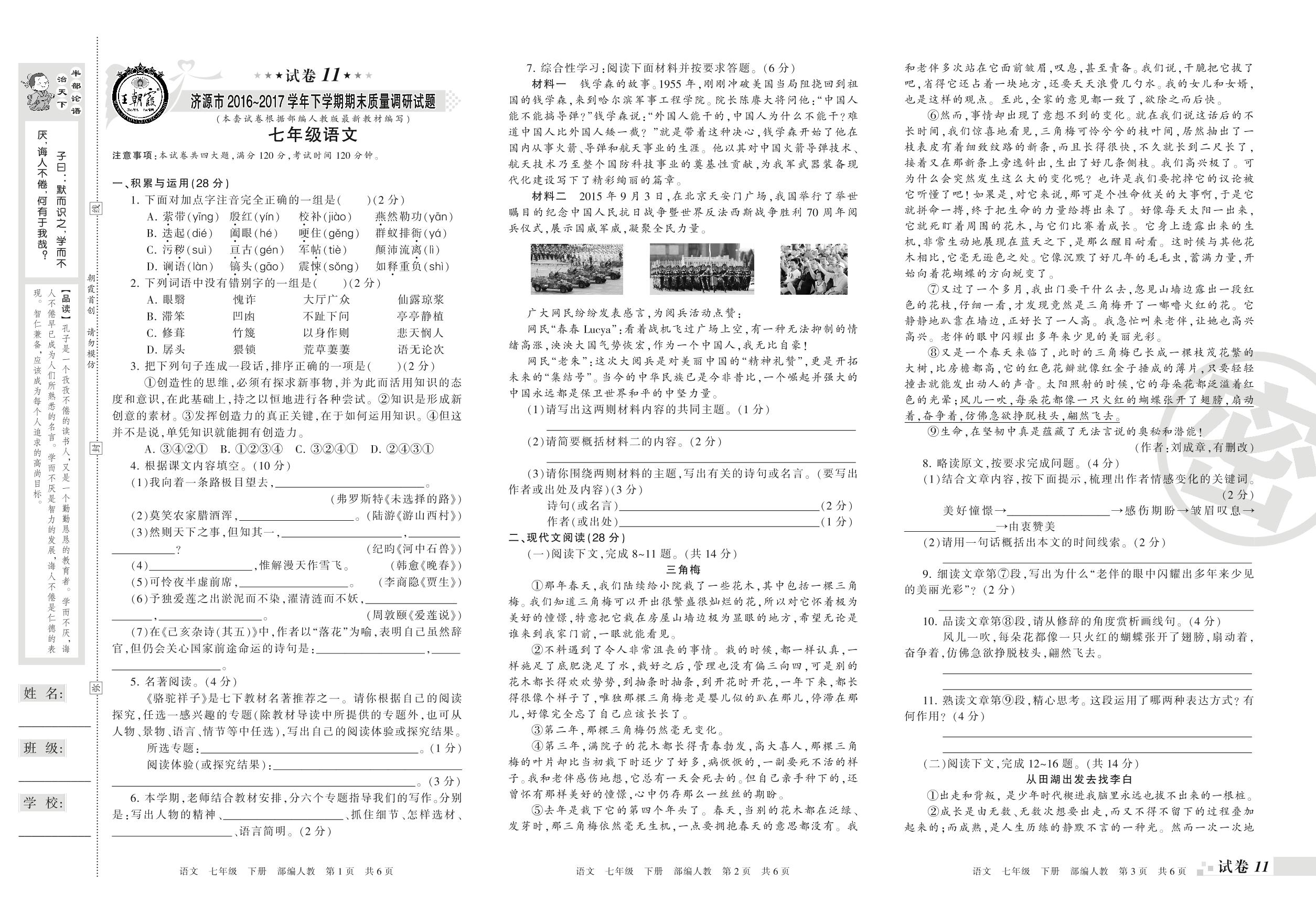 2016-2017学年第二学期济源市七年级语文试卷(人教版)【11】