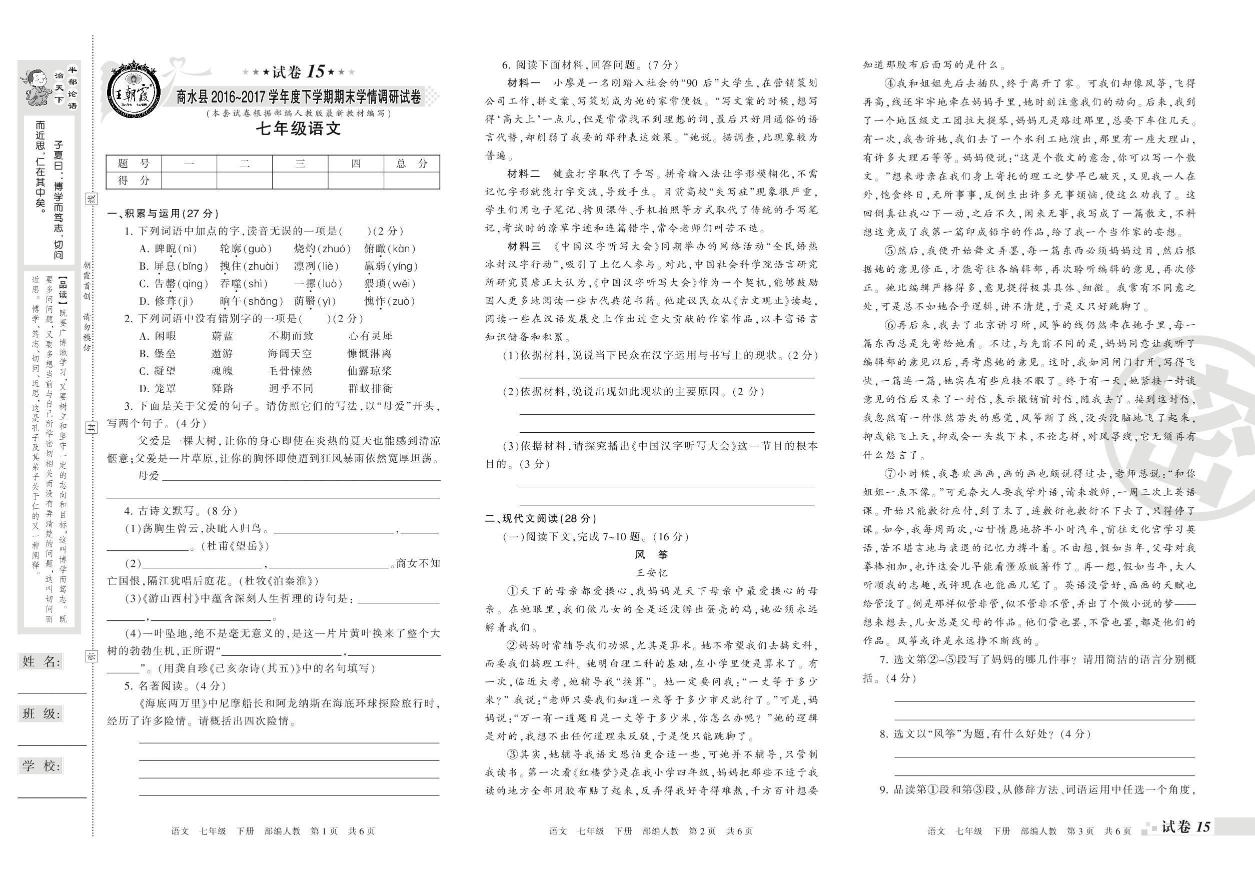 2016-2017学年第二学期周口市商水县七年级语文试卷(人教版)【15】