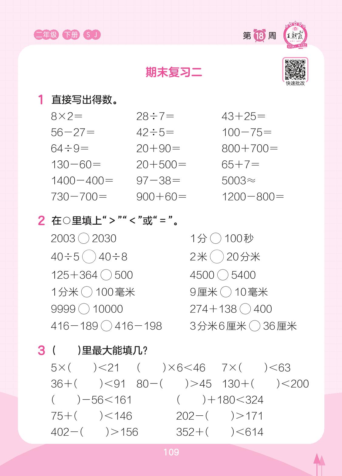 2023下册二年级数学苏教版 第18周 期末复习二