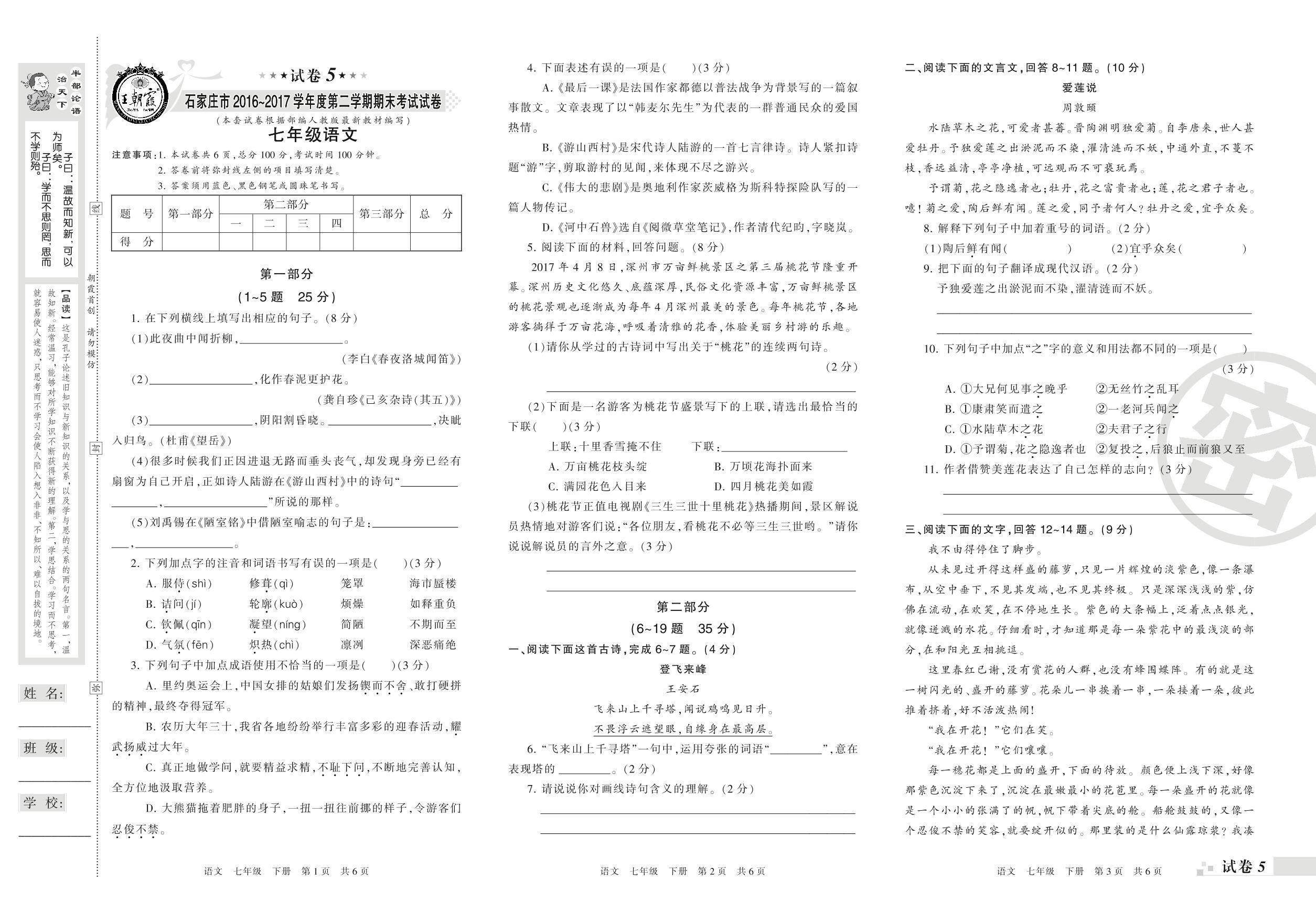2016-2017学年第二学期石家庄市七年级语文试卷(人教版)【5】