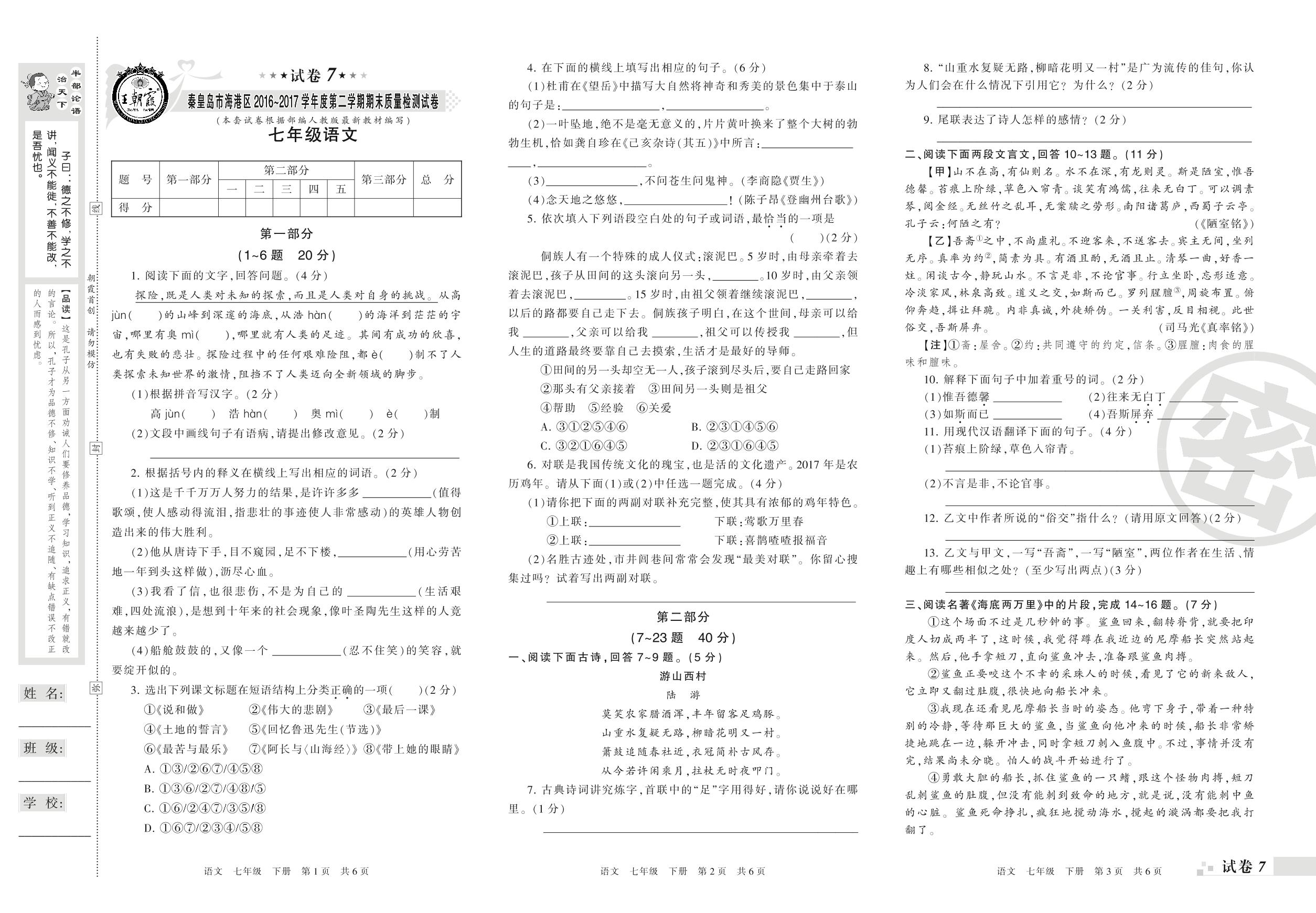 2016-2017学年第二学期秦皇岛市海港区七年级语文试卷(人教版)【7】