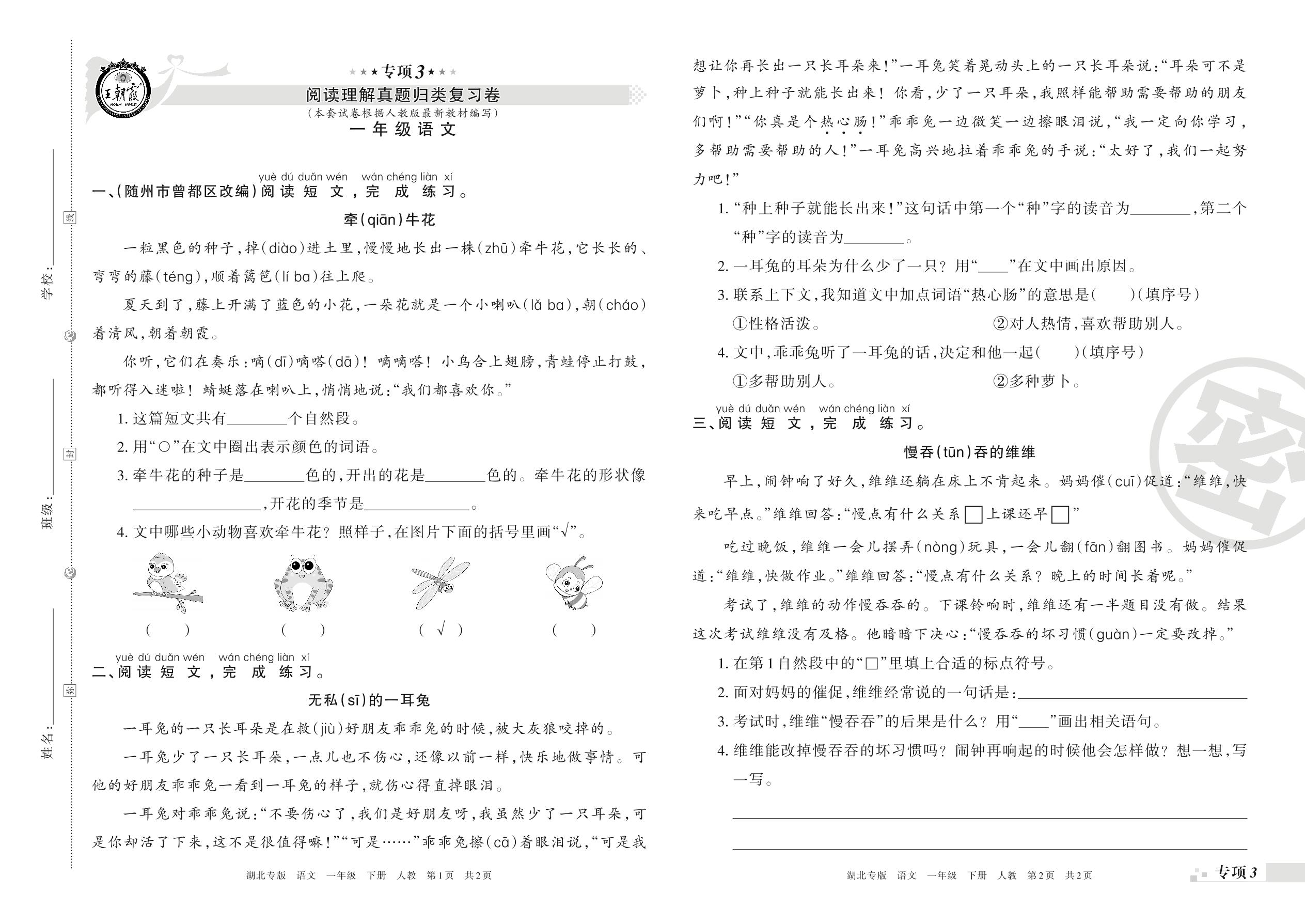 王朝霞期末专项卷——阅读理解、写话真题归类复习一年级下册语文(人教版)_R210731173357【0】