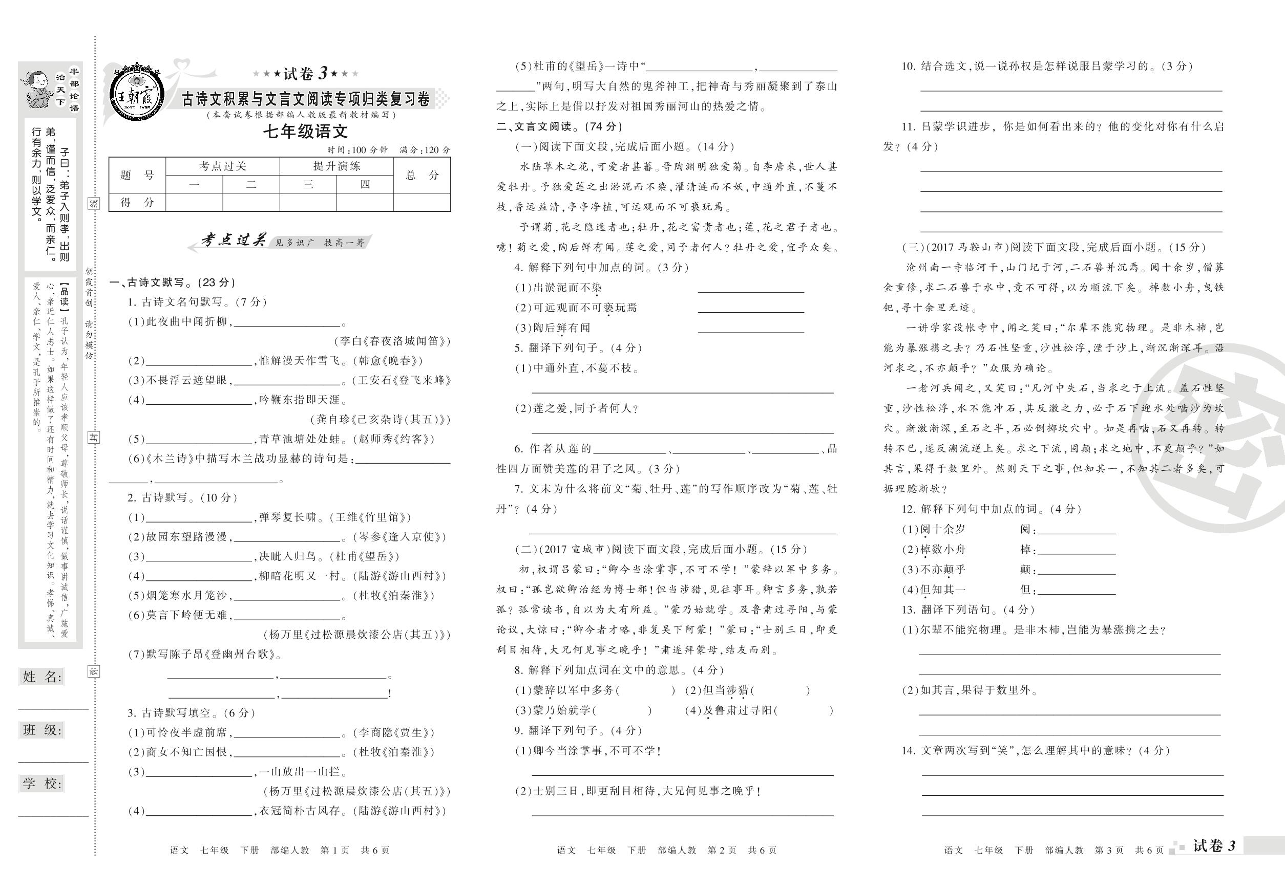 王朝霞期末专项卷——古诗文积累与文言文阅读专项归类复习卷七年级下册语文(人教版)_R210802164940【3】