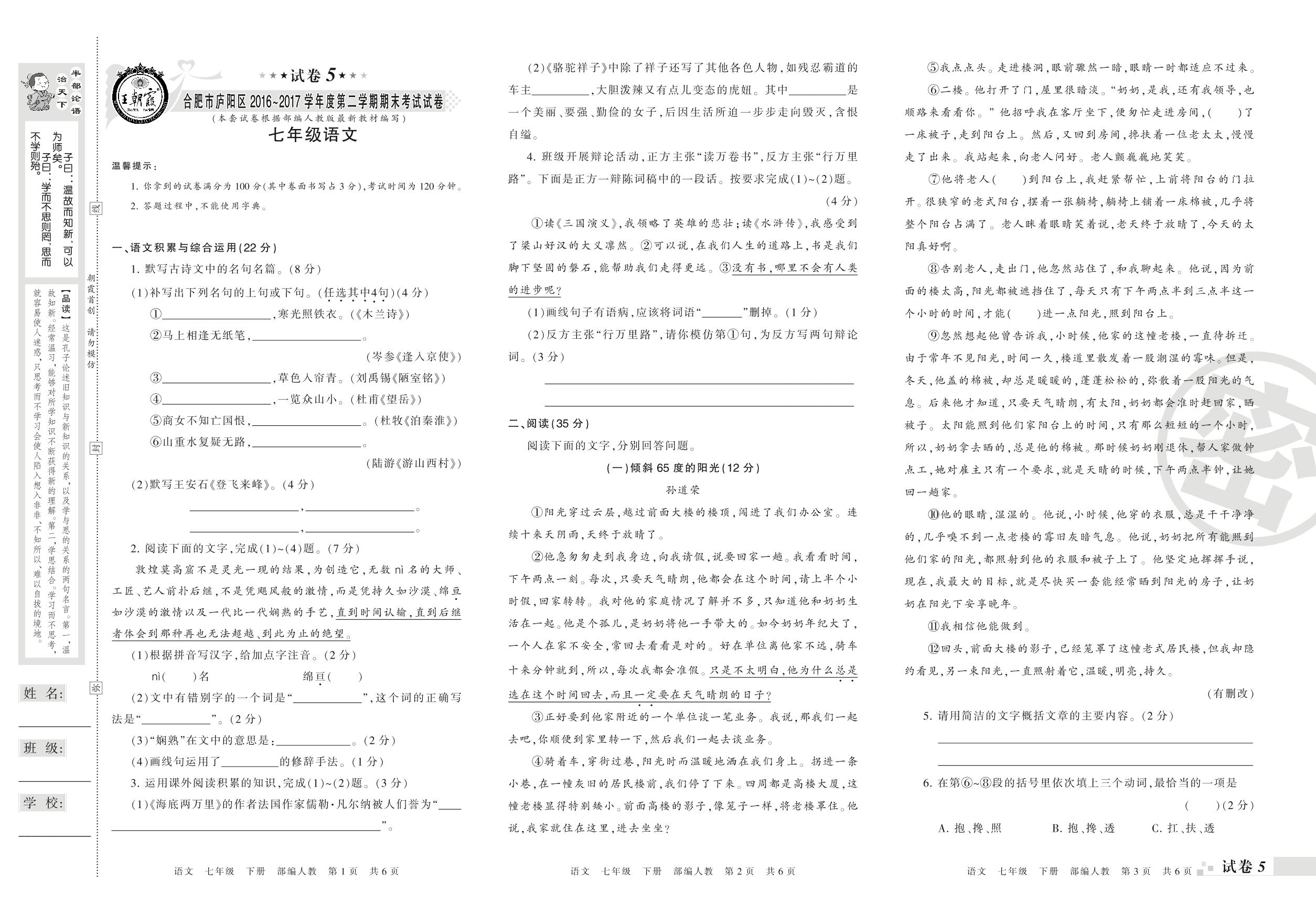 2016-2017学年第二学期合肥市庐阳区七年级语文试卷(人教版)【5】