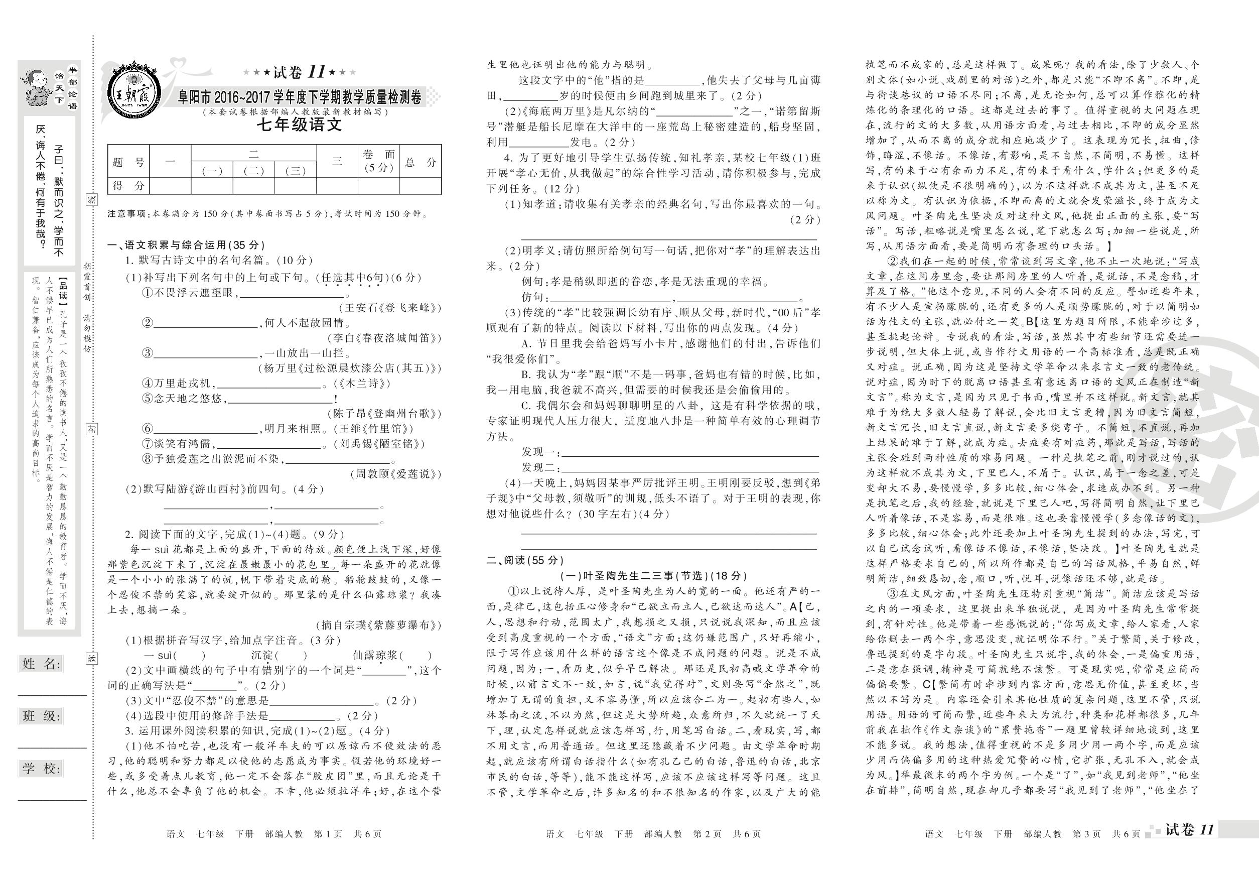 2016-2017学年第二学期阜阳市七年级语文试卷(人教版)【11】