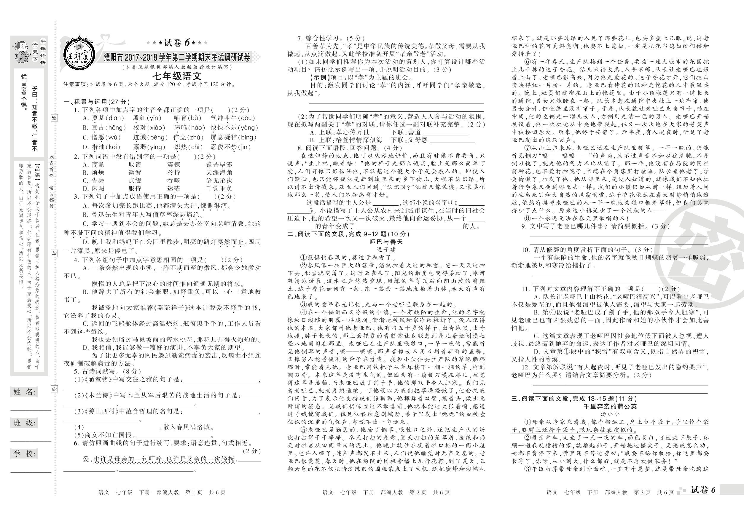2016-2017学年第二学期濮阳市七年级语文试卷(人教版)【6】