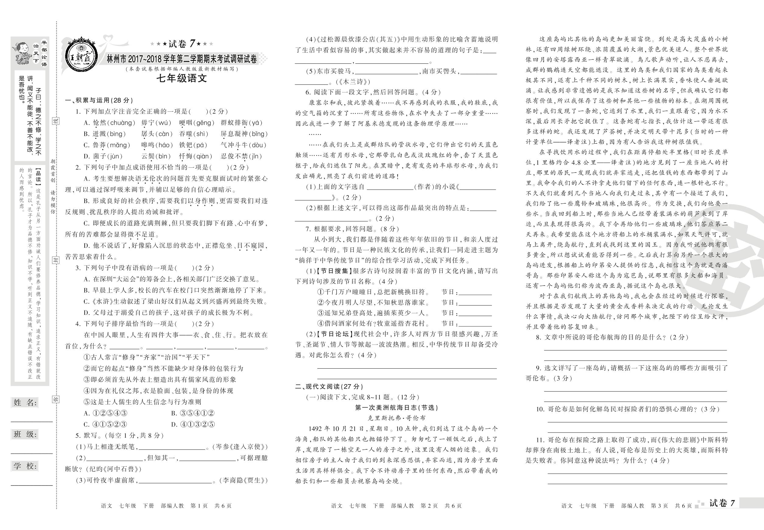 2016-2017学年第二学期林州市七年级语文试卷(人教版)【7】